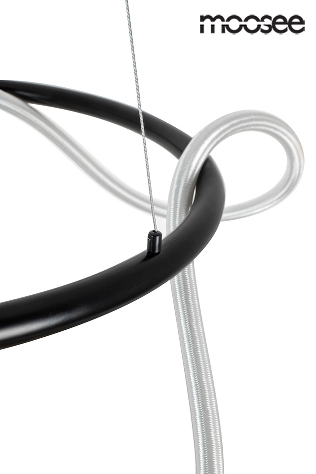 • MOOSEE lampa wisząca SERPIENTE 60 czarna. Okrągły, metalowy stelaż w kolorze czarnym przepleciony elastycznym wężem w oplocie z tkaniny, który skrywa ledowe źródło światła. Kontrastowe połączenie czerni z bielą świetnie odnajdzie się w subtelnych, eleganc