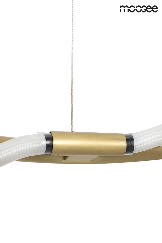 - MOOSEE lampa wisząca SERPIENTE 60 złota. Okrągły, metalowy stelaż w kolorze złotym przepleciony elastycznym wężem w oplocie z tkaniny, który skrywa ledowe źródło światła. Zestawienie kolorystyczne złota z bielą świetnie odnajdzie się w subtelnych, eleganc