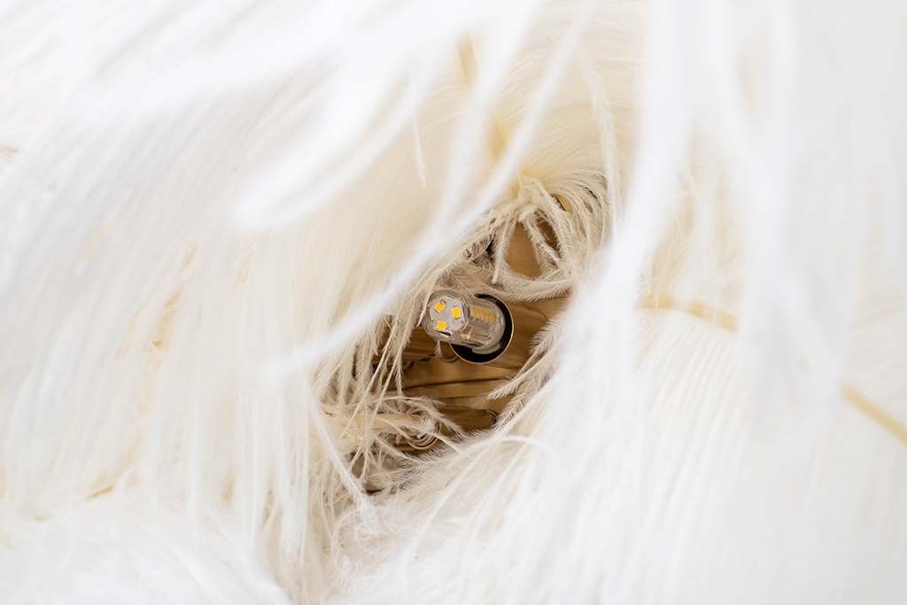 - MOOSEE lampa wisząca TIFFANY biała. Klosz tworzy 80 sztuk gęsto ułożonych, naturalnych strusich piór o długości 55-60 cm, którymi możemy regulować wysokość całkowitą oraz kształt lampy. Całość została przymocowana do podsufitki mosiężnym łańcuchem w natur
