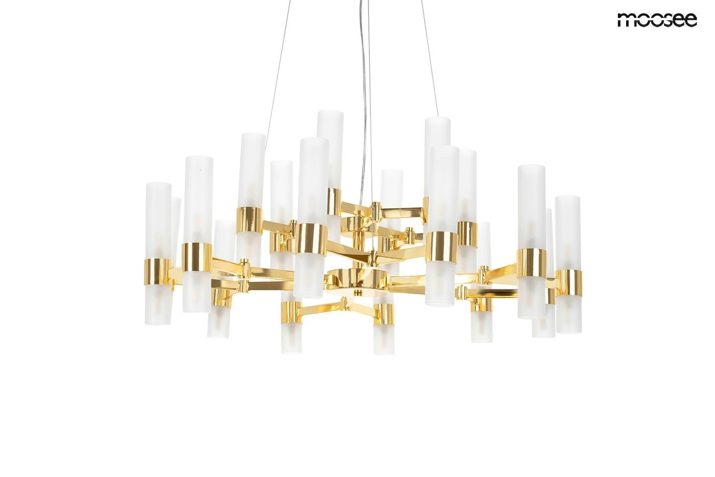 - MOOSEE lampa wisząca TUBS 18 złota. Tubs to wyrafinowane połączenie klasyki z nowoczesnym designem, prezentujące się w efektownym, bogatym złotym wykończeniu. Imponująca konstrukcja składa się z 36 eleganckich, białych szklanych kloszy, które subtelnie ro