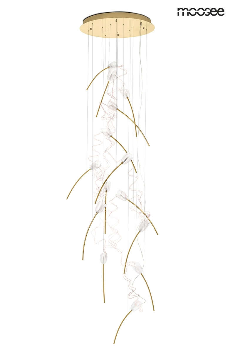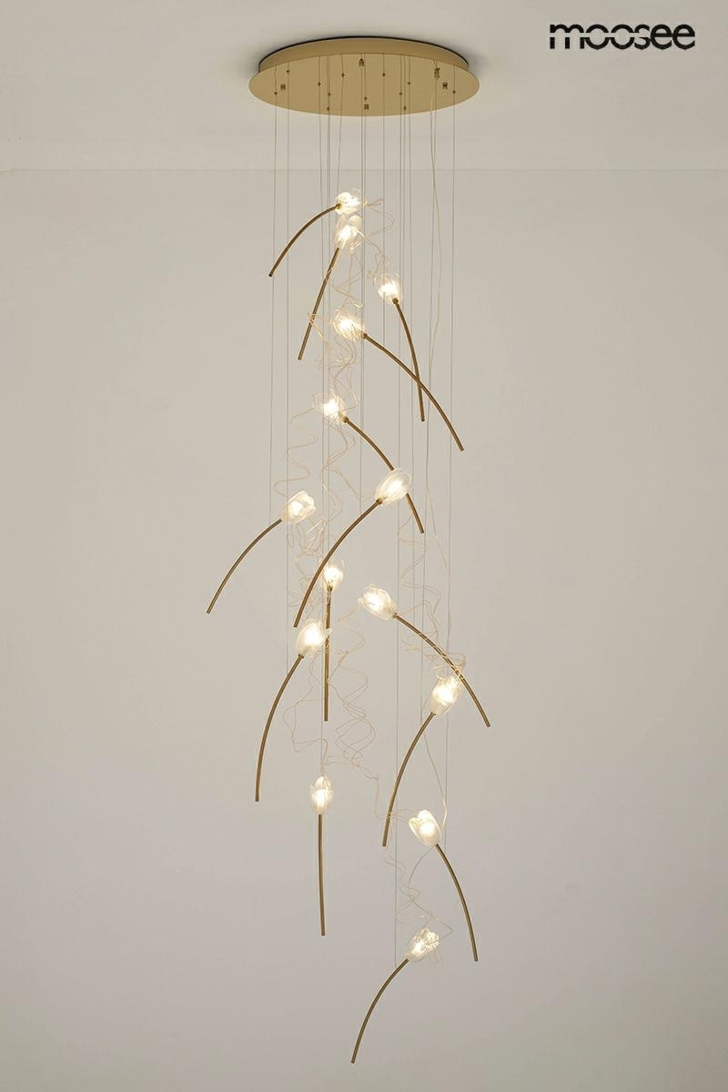 • MOOSEE lampa wisząca TULIPPE 14 DISC złota. Piękna, wyjątkowa oprawa, która nie tylko oświetli, ale i ozdobi nie jedno wnętrze. Przezroczyste, akrylowe klosze imitują kwiaty, tulipany, które w niezwykły sposób rozpraszają strumienie światła. Złote wykończ