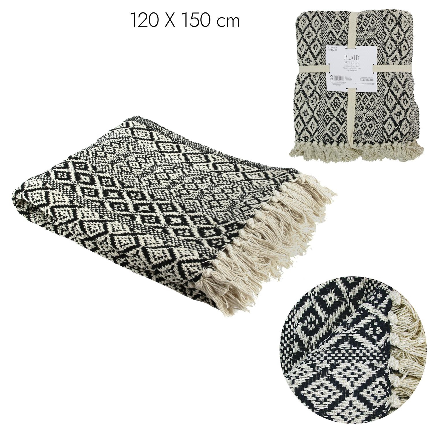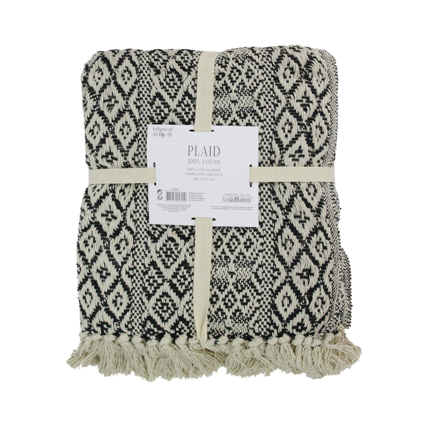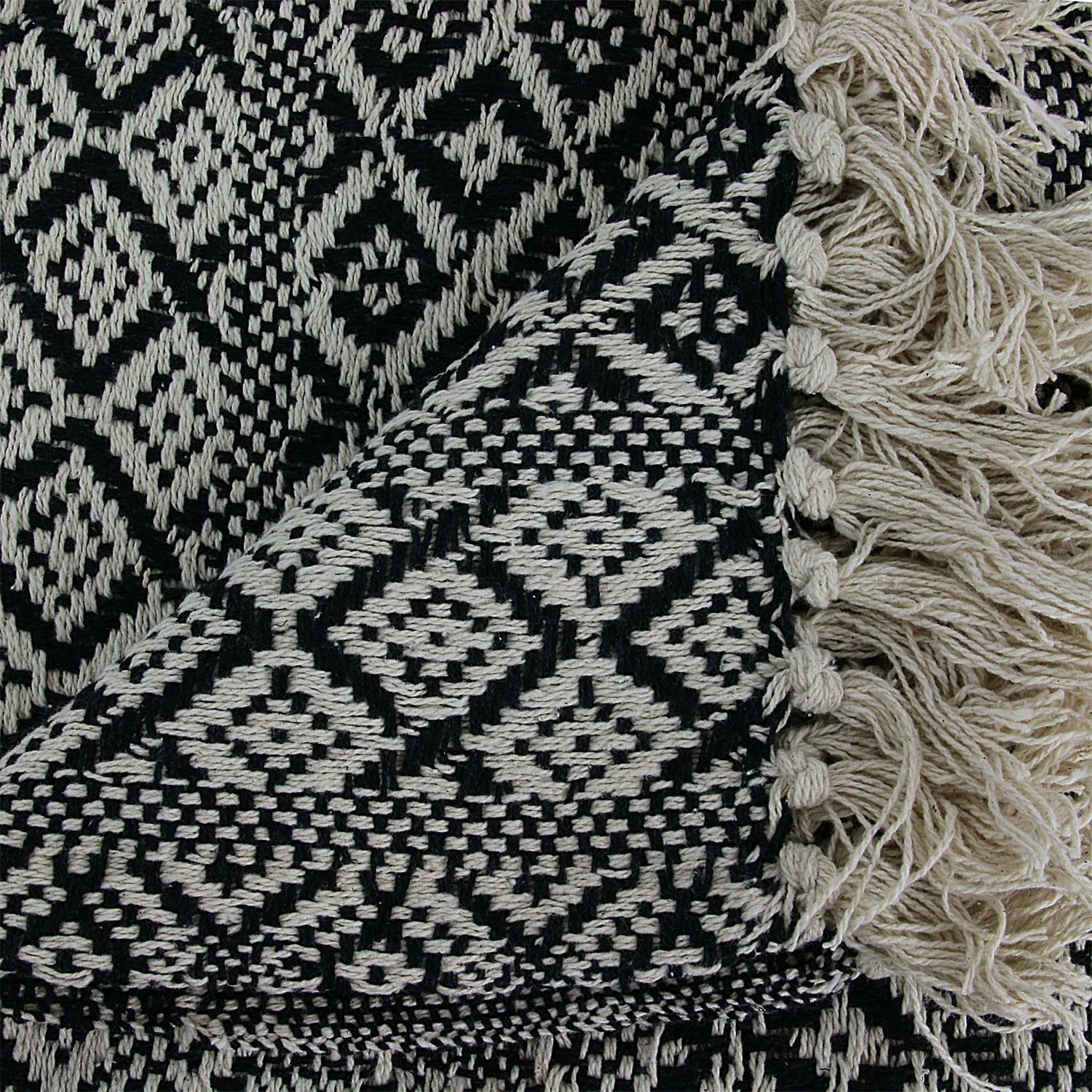 Narzuta wykonana w 100% z bawełny sprawdzi się we wnętrzu w orientalnym stylu. Czarno-biały wzór koca dopełniają frędzelki na brzegu.
