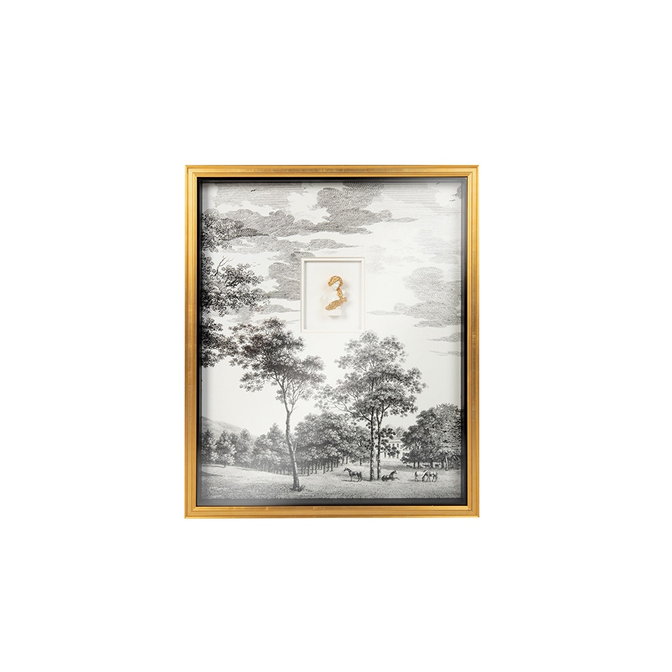 Obraz HEAD OF STATE 1 50x60 cm. Elegancka i nowoczesna grafika, wykonana w stonowanej kolorystyce i oprawiona w stylową złotą ramę. W centrum kompozycji umieszczono rzeźbę kobiety ze złotym akcentem, która dodaje nowoczesnego charakteru i przyciąga uwagę. Obraz przedstawia spokojny krajobraz z trawą, drzewami i końmi, emanujący relaksującą atmosferą. Ta oryginalna koncepcja doskonale wpasowuje się w nowoczesne wnętrza, wnosząc harmonię i artystyczny wyraz. Head of State to dzieło sztuki, które nie tylko zdobi, ale również wprowadza do przestrzeni poczucie spokoju i elegancji. Wymiary: wys. 60 cm / szer. 50 cm / gł. 3 cm.Cechy produktu