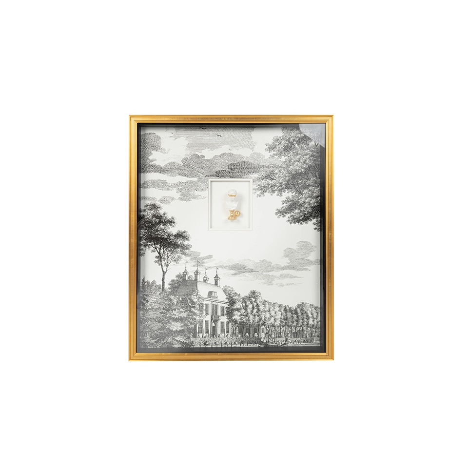 Obraz HEAD OF STATE 4 50x60 cm. Elegancka i nowoczesna grafika, wykonana w stonowanej kolorystyce i oprawiona w stylową złotą ramę. W centrum kompozycji umieszczono rzeźbę kobiety ze złotym akcentem, która dodaje nowoczesnego charakteru i przyciąga uwagę. Obraz przedstawia spokojny krajobraz z pięknym pałacem, emanujący relaksującą i szykowną atmosferą. Ta oryginalna koncepcja doskonale wpasowuje się w nowoczesne wnętrza, wnosząc harmonię i artystyczny wyraz. Head of State to dzieło sztuki, które nie tylko zdobi, ale również wprowadza do przestrzeni poczucie spokoju i elegancji. Wymiary: wys. 60 cm / szer. 50 cm / gł. 3 cm.Cechy produktu