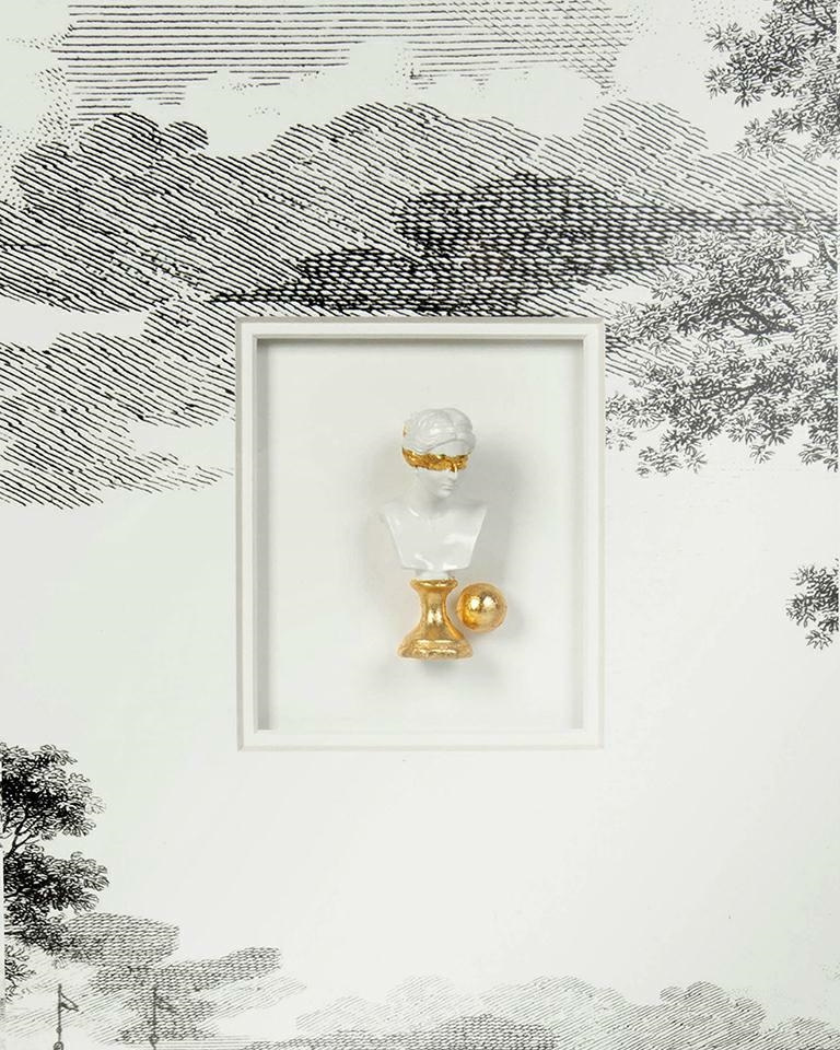 - Obraz HEAD OF STATE 4 50x60 cm. Elegancka i nowoczesna grafika, wykonana w stonowanej kolorystyce i oprawiona w stylową złotą ramę. W centrum kompozycji umieszczono rzeźbę kobiety ze złotym akcentem, która dodaje nowoczesnego charakteru i przyciąga uwagę.