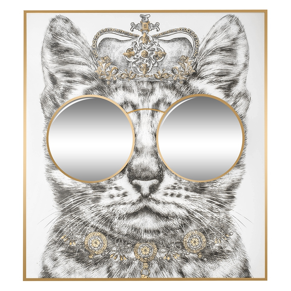 - Obraz KING CAT 193 x 213 cm. Piękny, nowoczesny druk utrzymany w jednolitej, stonowanej kolorystyce ze złotymi detalami, przedstawiający kota w koronie i okularach przeciwsłonecznych. Okulary zostały wyróżnione lustrzanym elementem, co dodaje kompozycji w