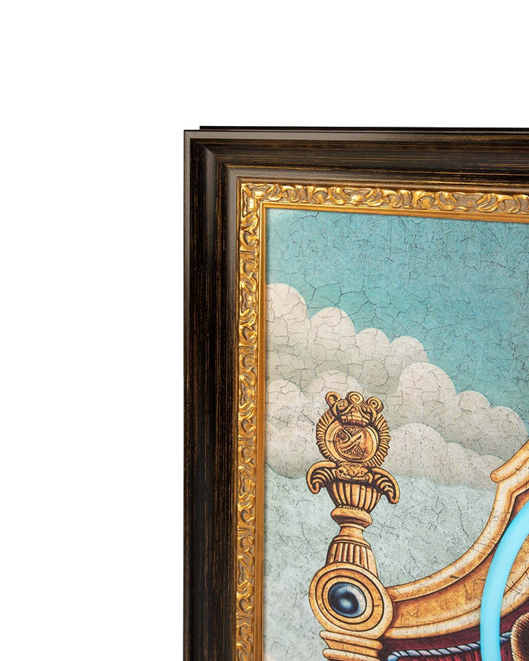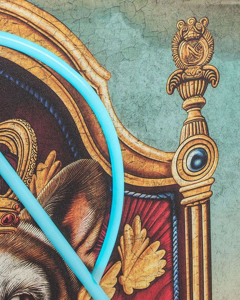 Obraz NEON BULLDOG 80x100 cm. Modernistyczny obraz przedstawia pięknego, słodkiego psa rasy Bulldog, którego ludzie pokochali. Obraz został przedstawiony w bujnych kolorach, wzbogacony o podświetlany niebieski led. Komiczny sposób przedstawienia psa, siedzącego na tronie, w arystokratycznym ubraniu z koroną na głowie przyciąga uwagę i wzbudza ciekawość. Na drugim planie obrazu widzimy piękne niebo i morze. Całość oprawiono w klasyczną, grubą ramę która dodaje elegancji całości i charakteru. Światło: LED 10 W / 800 lm Wymiary: wys. 100 cm / szer. 80 cm / gł. 8 cm.Cechy produktu