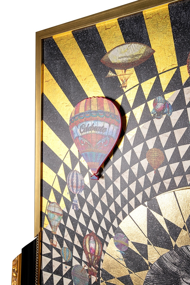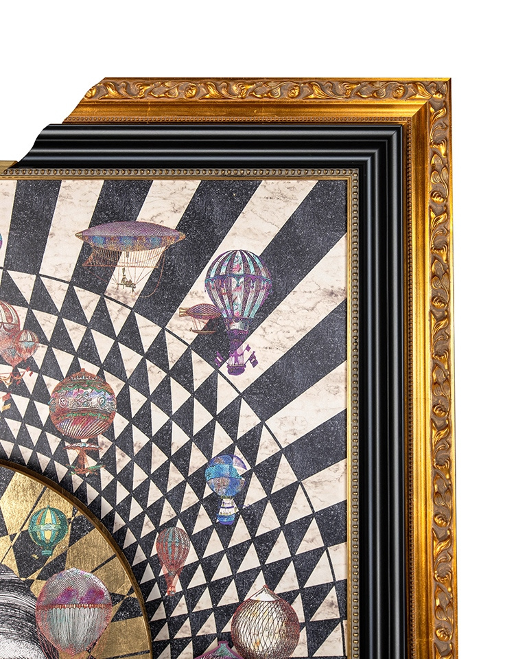 Obraz WARSAW GIRL 110x174 cm. Piękny projekt graficzny, wyróżniający się nietypowym i oryginalnym formatem. Przedstawia tętniące życiem duże miasto, z pięknymi budynkami o wyjątkowej architekturze, nad którymi unoszą się kolorowe balony. Ukazane miasto to stolica Polski Warszawa, dla której głównymi symbolami jest pałac kultury, syrenka warszawska oraz stare miasto, które tu wyszczególniono. Centralnym punktem przyciągającym wzrok jest dziewczęca twarz przedstawiona jako słońce, emanująca energią i życiem dla miasta. Dzieło wykonano w stonowanej kolorystyce z delikatnymi kolorowymi oraz złotymi akcentami, co nadaje mu subtelności i elegancji. Obraz jest oprawiony w ramę, jednak to, co najbardziej go wyróżnia, to fakt, że tylko część kompozycji znajduje się w ramie, tworząc wspaniałe dzieło sztuki i hołd dla oryginalnej twórczości. Wymiary: wys. 174 cm / szer. 110 cm / gł. 3 cm.Cechy produktu