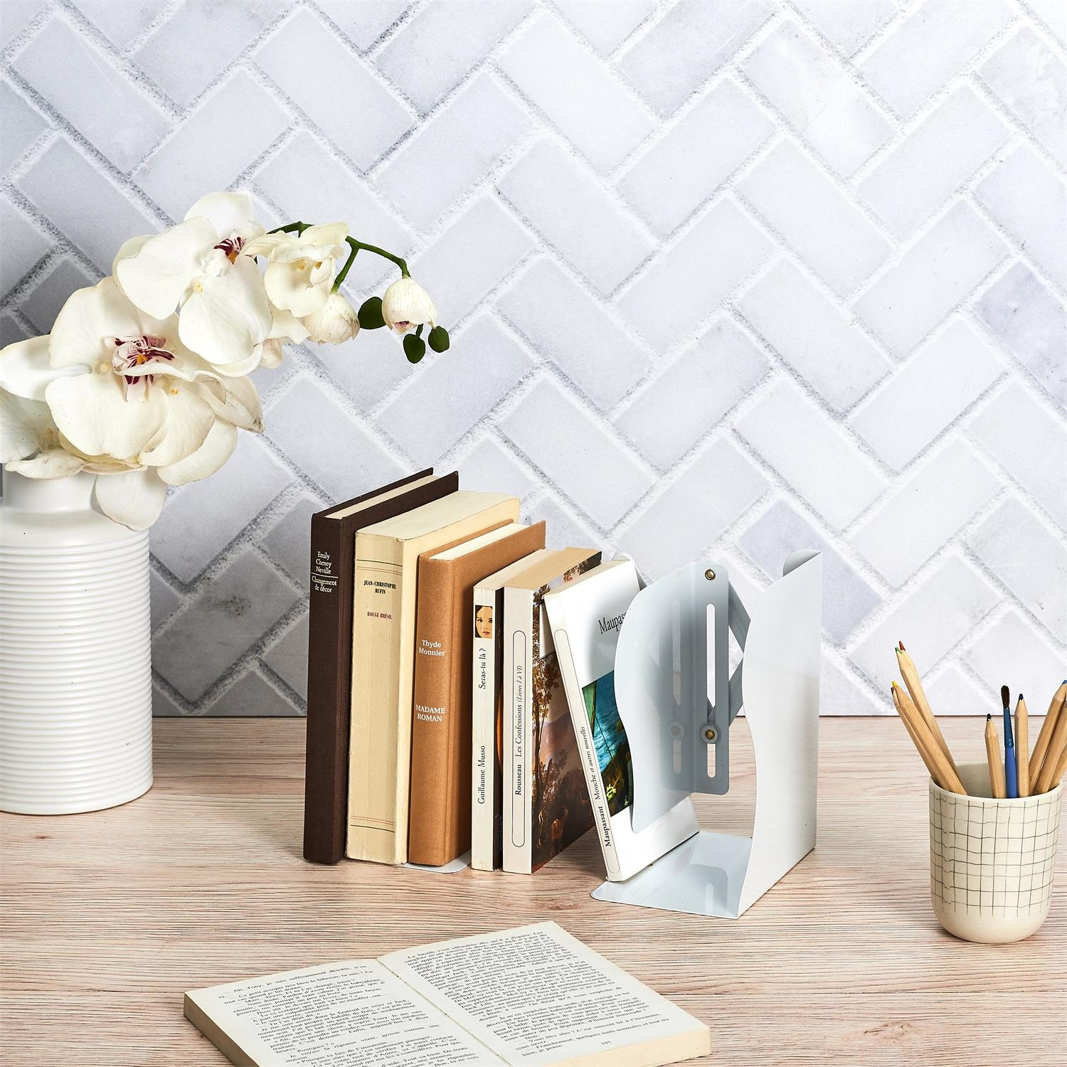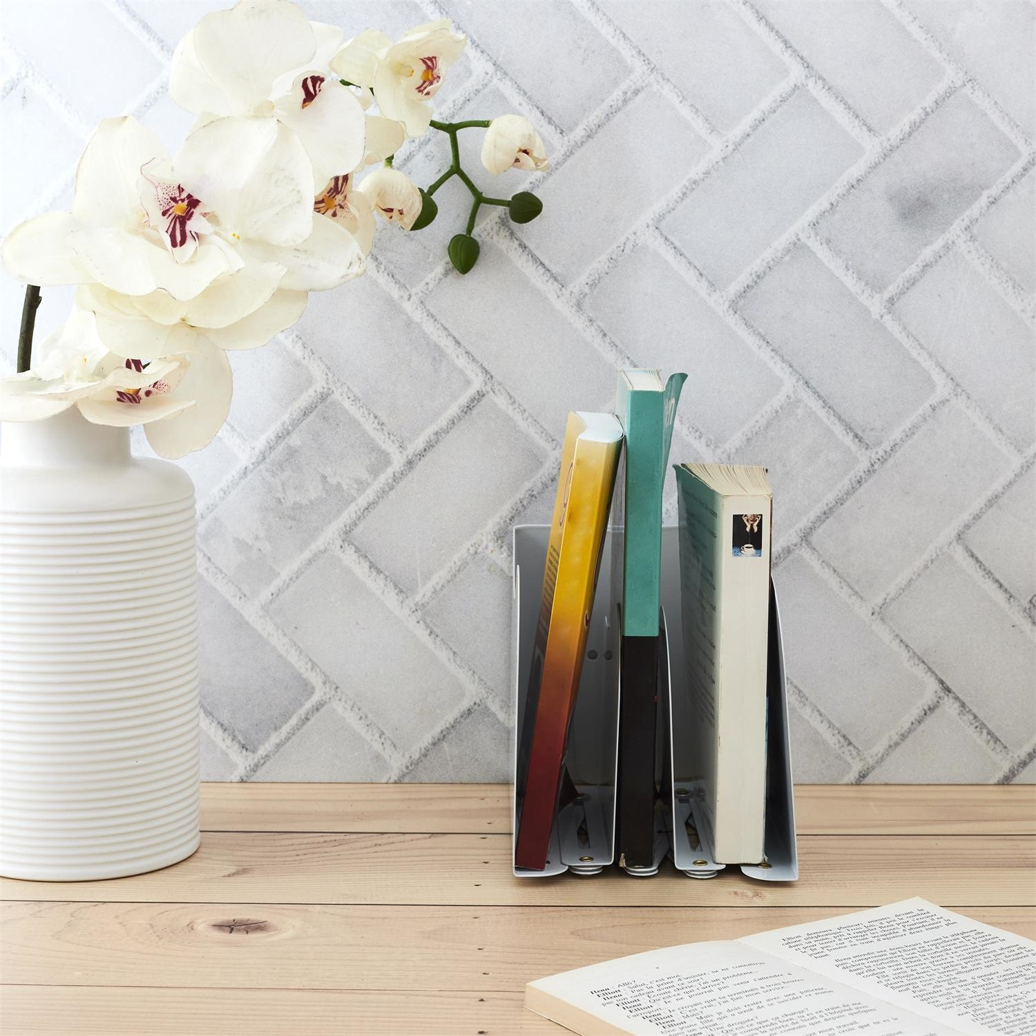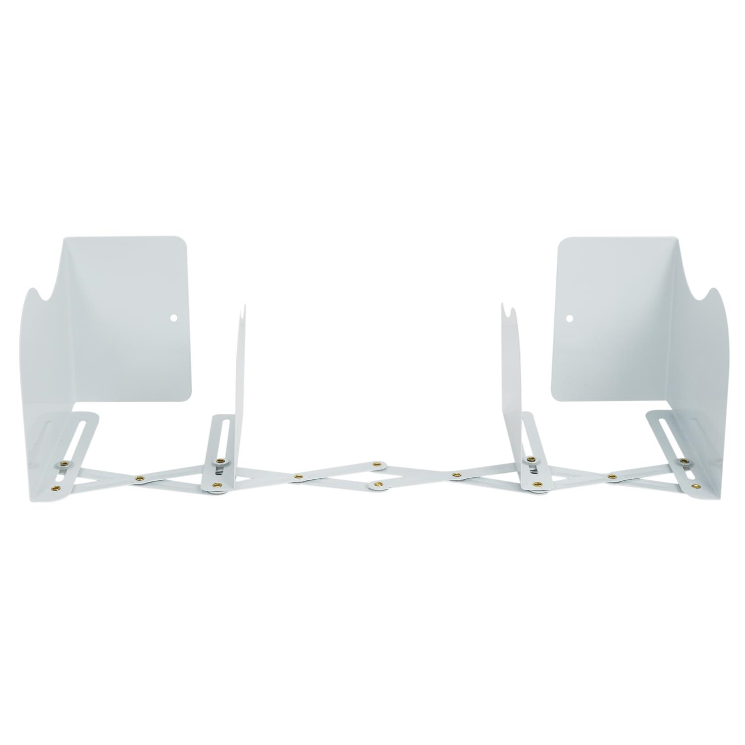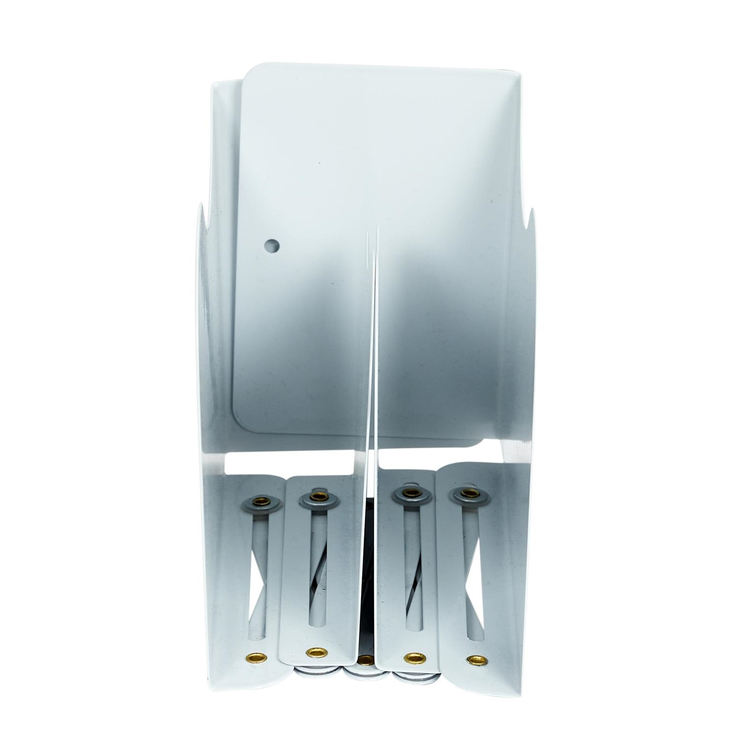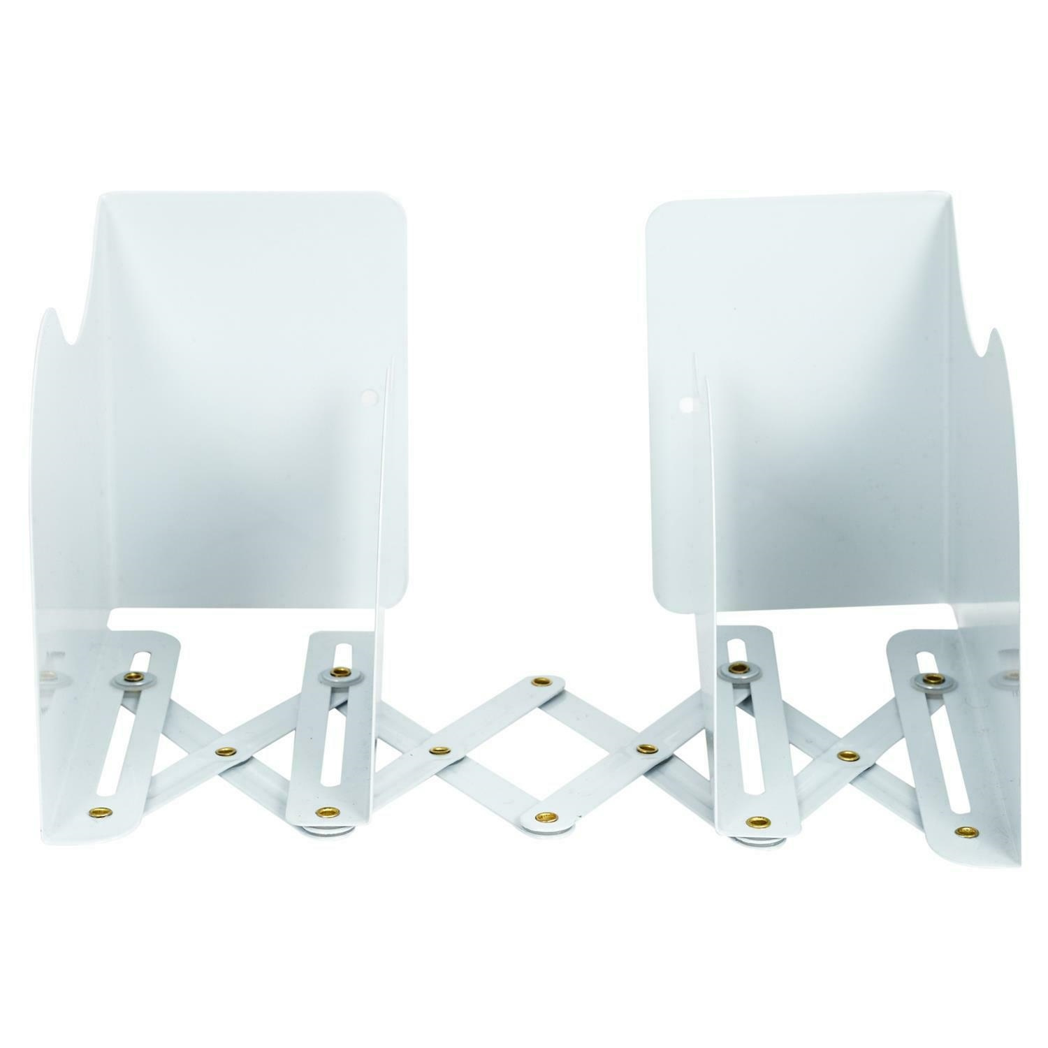 Uniwersalny organizer o regulowanej szerokości sprawdzi się w biurze na segregatory lub książki lub w domowej biblioteczce. Organizer wyposażony został w dwie ścianki oraz dodatkowe dwie przegródki, które pozwolą na segregację książek lub segregatorów. Organizer o regulowanej szerokości wykonany został z metalu pomalowanego na biało. Wymiary po złożeniu: 10x15x19cm Maksymalna szerokość 46 cm Minimalna szerokość 10cm Wymiary kartonu: 24x33x42,5cm. Max 8 szt w kartonieCechy produktu