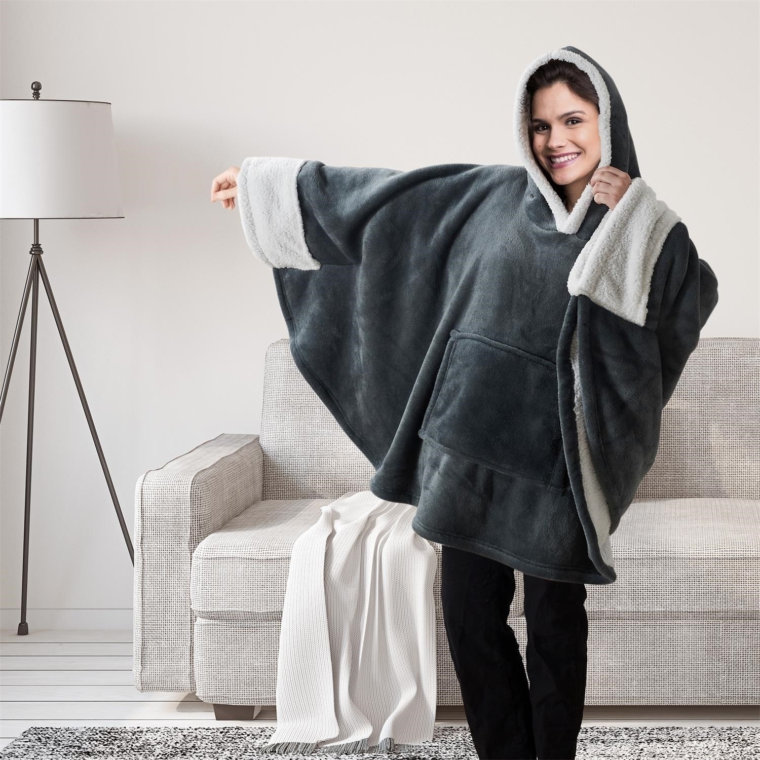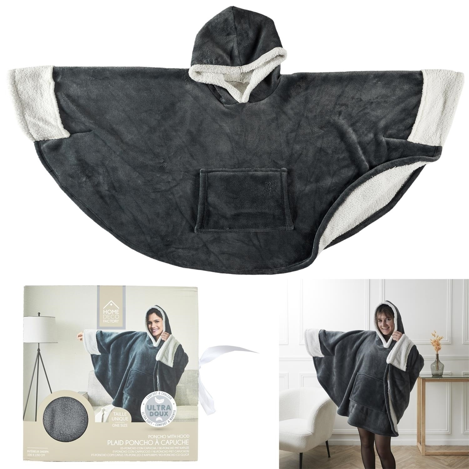 Pled ponczo szare z kapturem i kieszenią