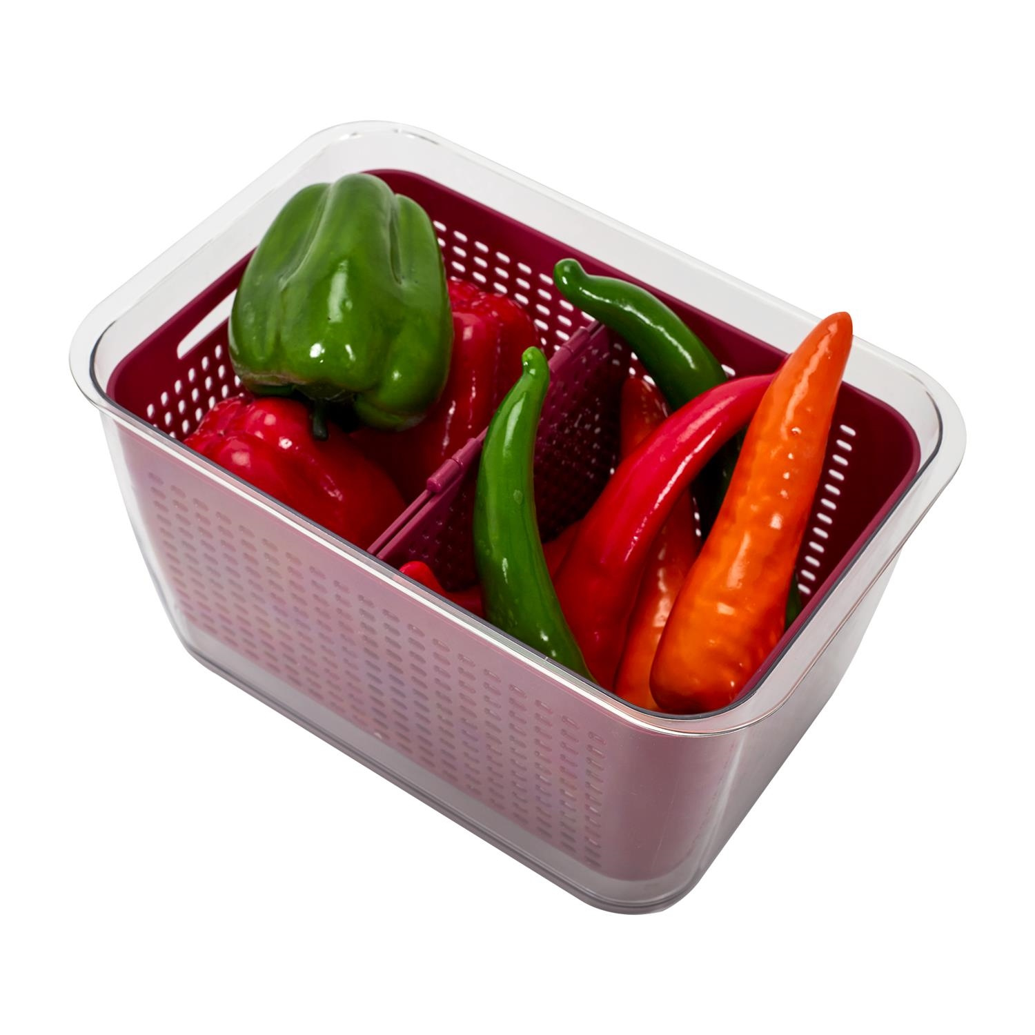 Pojemnik do przechowywania w lodówce owoców i warzyw pozwoli na utrzymaniu w świezości naszego pożywienia. Pojemnik wyposażony został w ażurowy kosz z możliwością podzielenia go na dwa. Kosz umieszczony dodatkowo w transparentnym pojemniku z pokrywką pozwala na utrzymanie w świeżości,a zapachy z lodówki nie docierają do zabezpieczonych produktów. Pojemnik wykonany z polipropylenu
