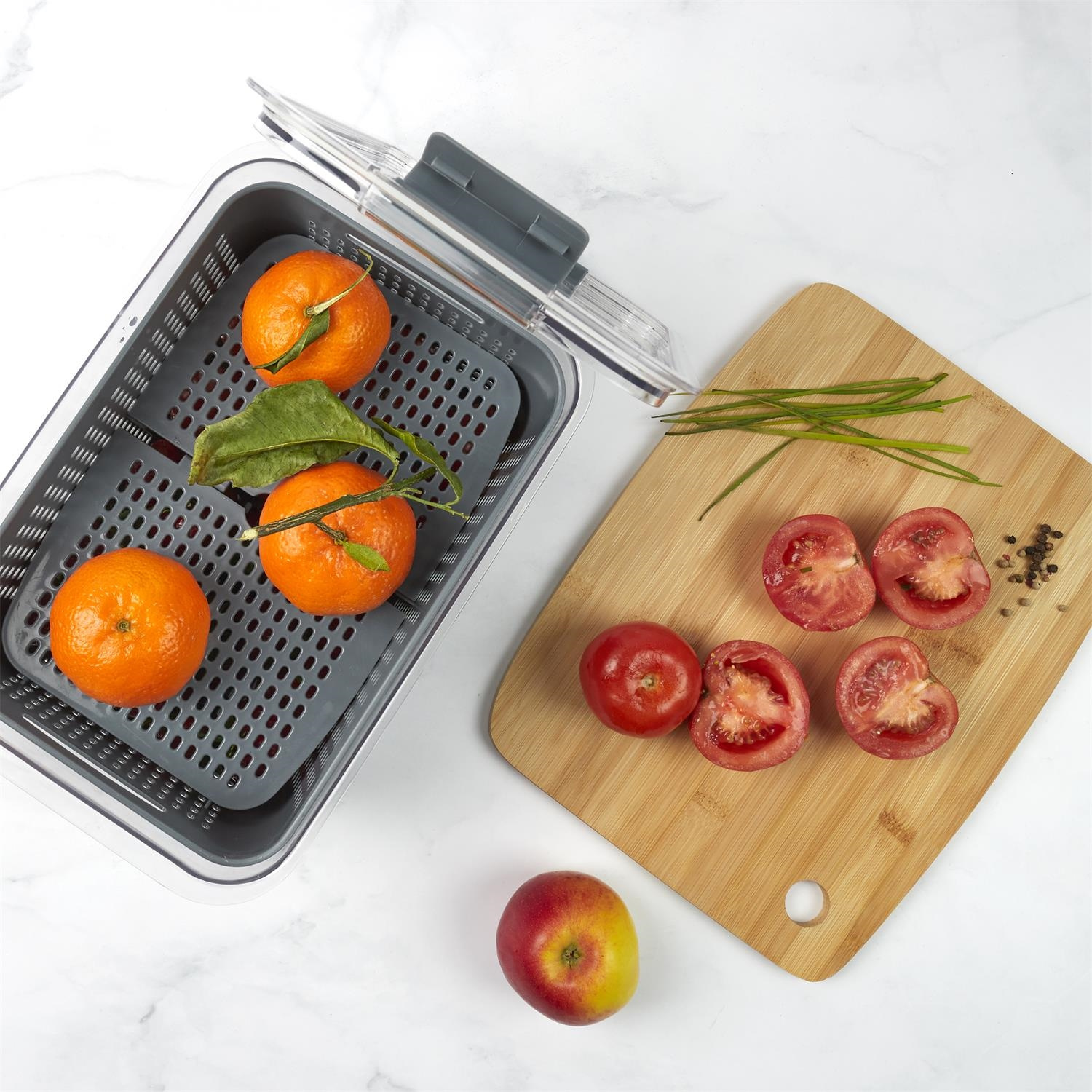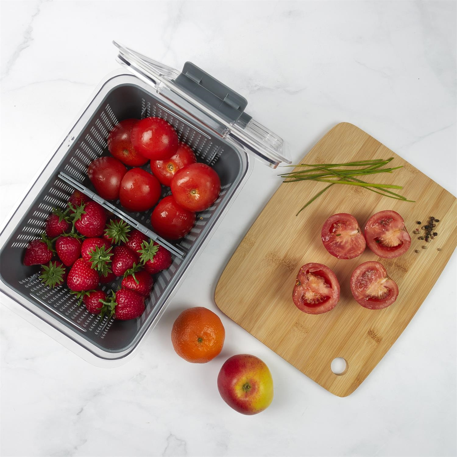 Pojemnik do organizacji owoców, warzyw lub innych produktów w lodówce.Pojemnik wyposażony w 3 przegródi oraz transparentną pokrywę. Wykonany polipropyleniu. Można myć w zmywarce
