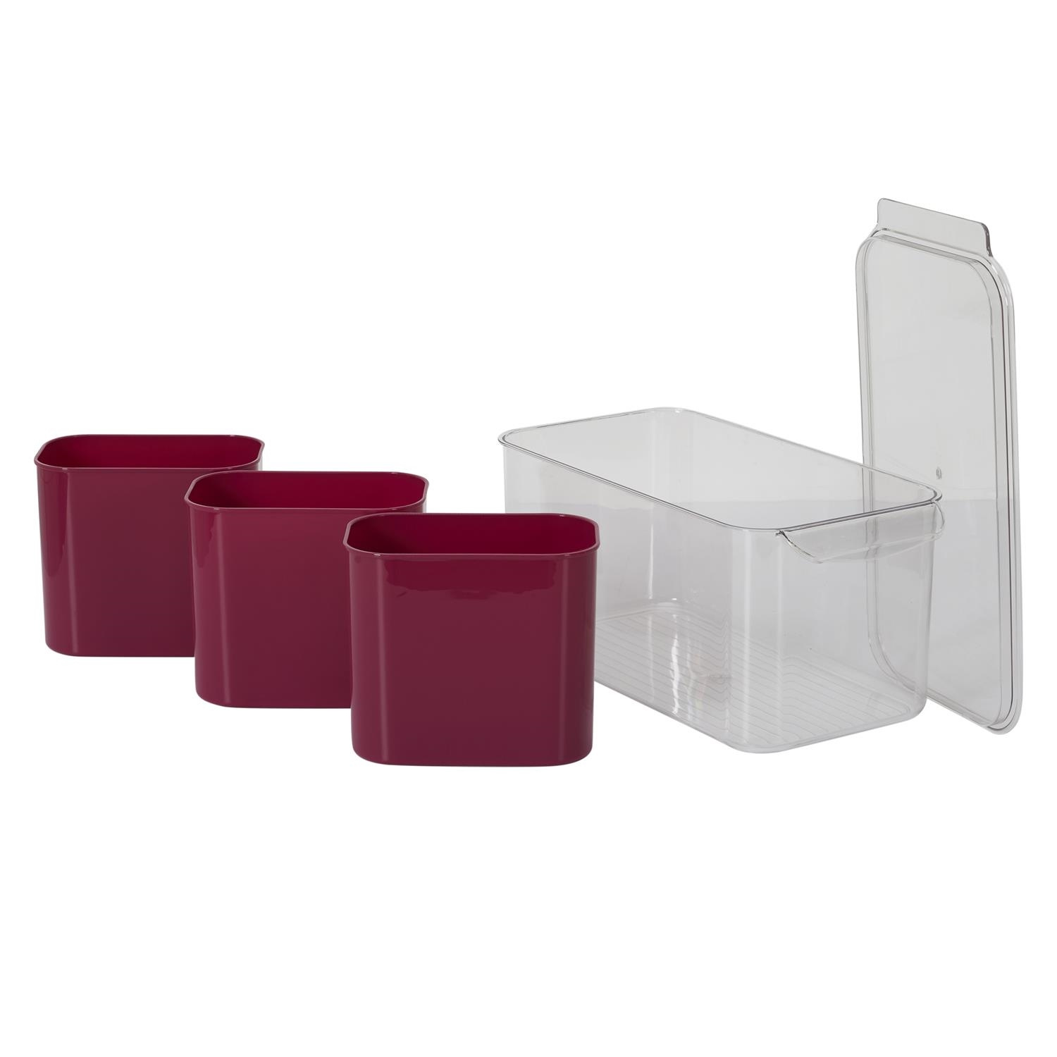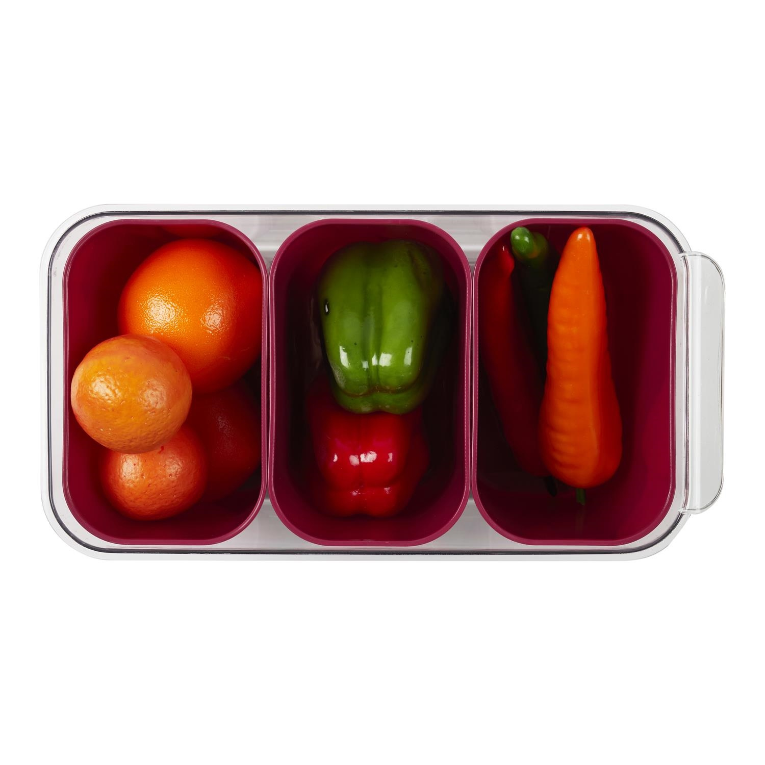 Pojemnik do organizacji owoców, warzyw lub innych produktów w lodówce.Pojemnik wyposażony w 3 przegródi oraz transparentną pokrywę. Wykonany polipropyleniu. Można myć w zmywarce