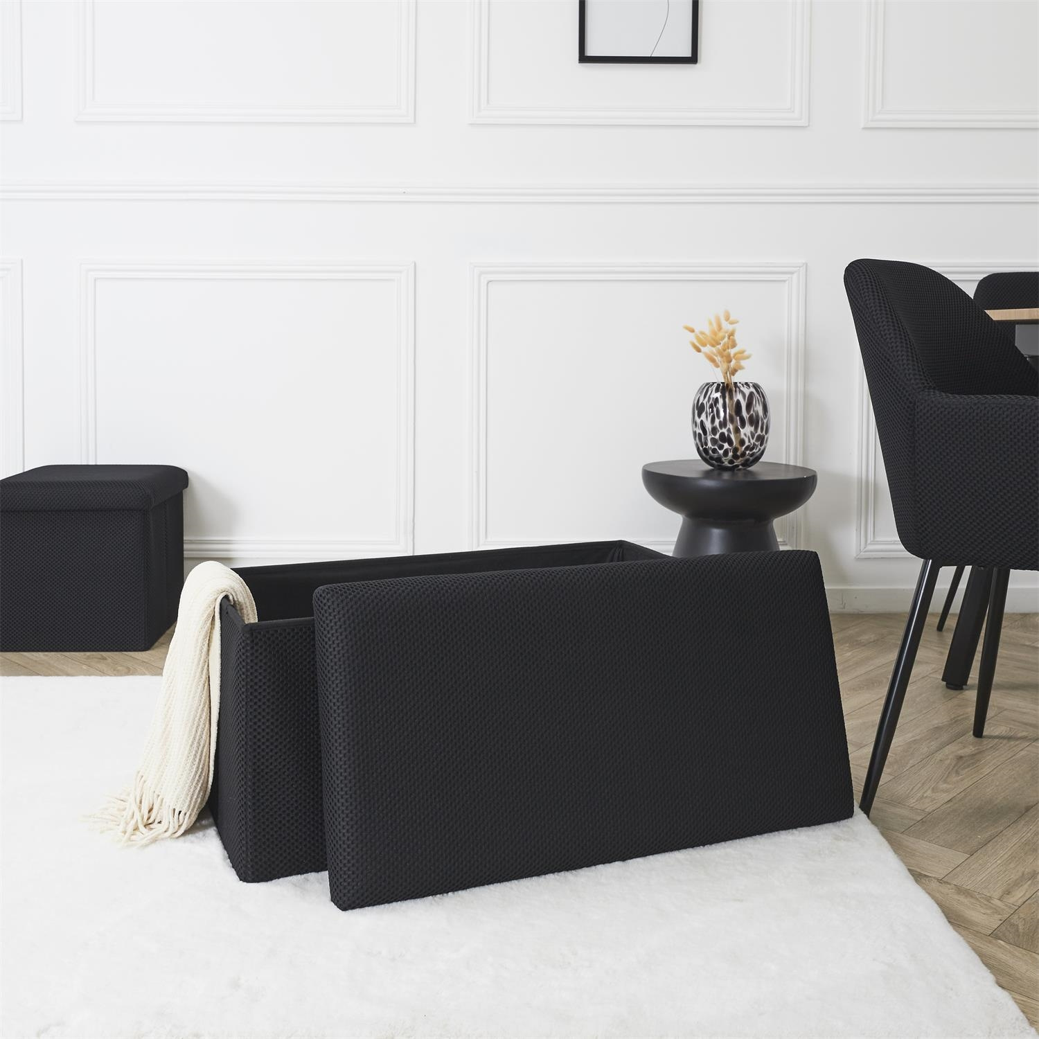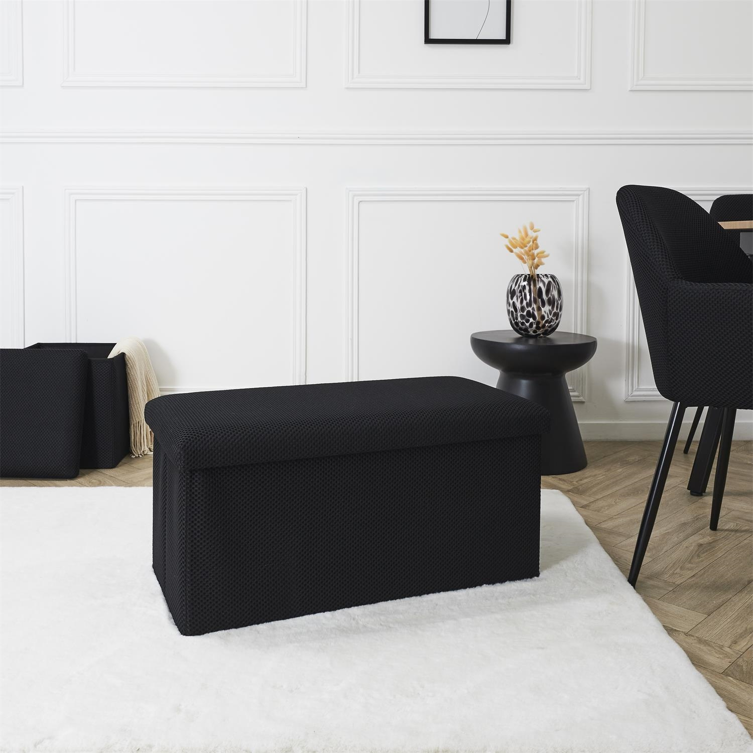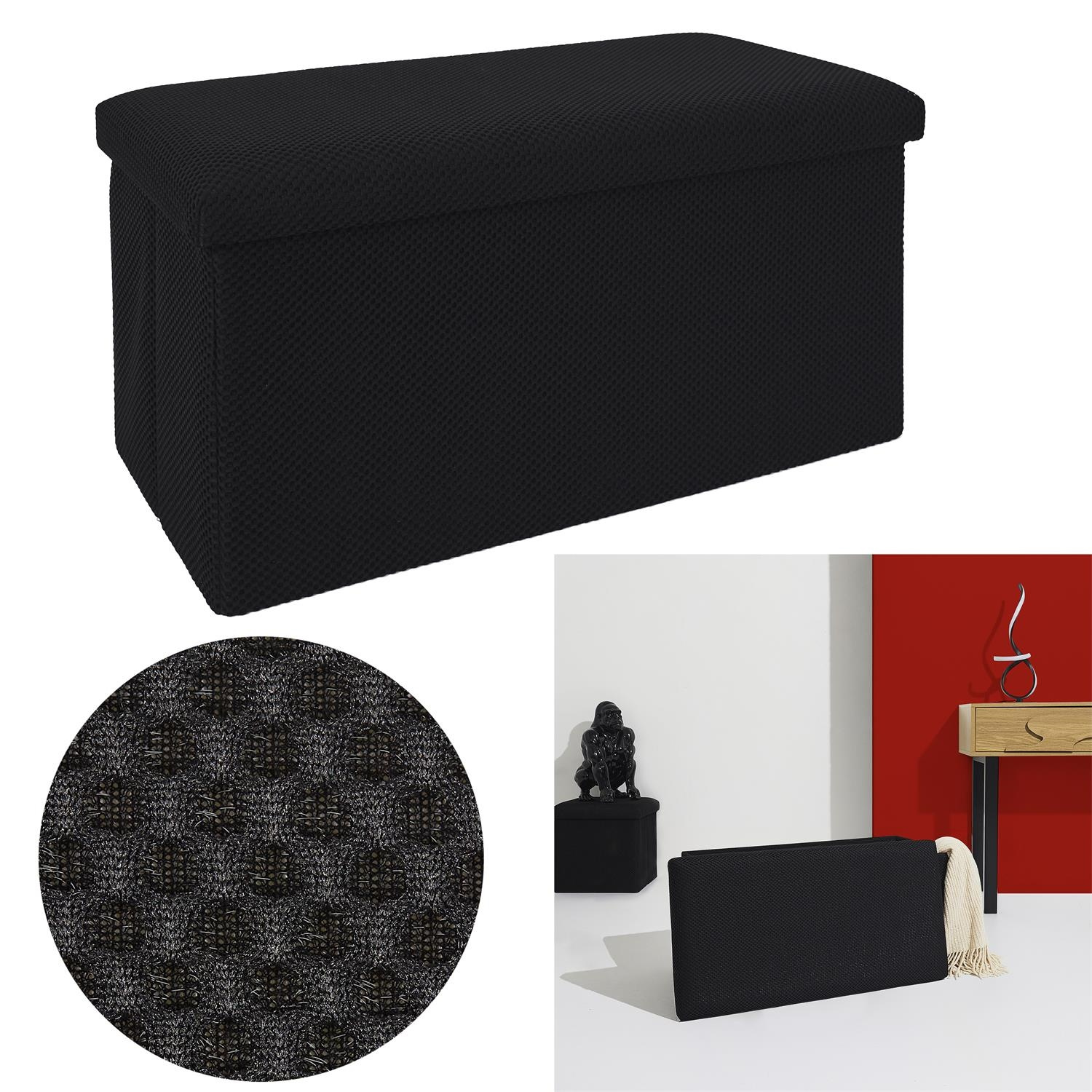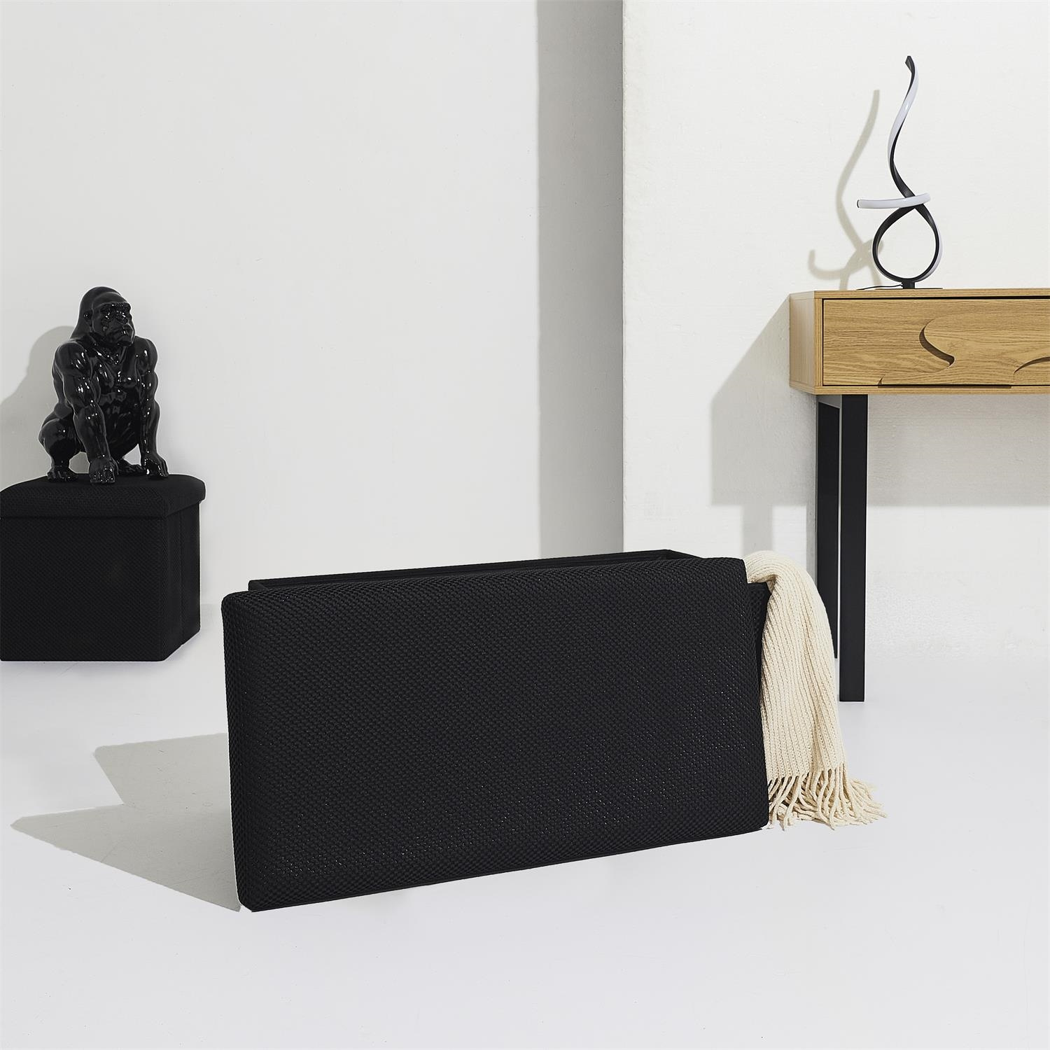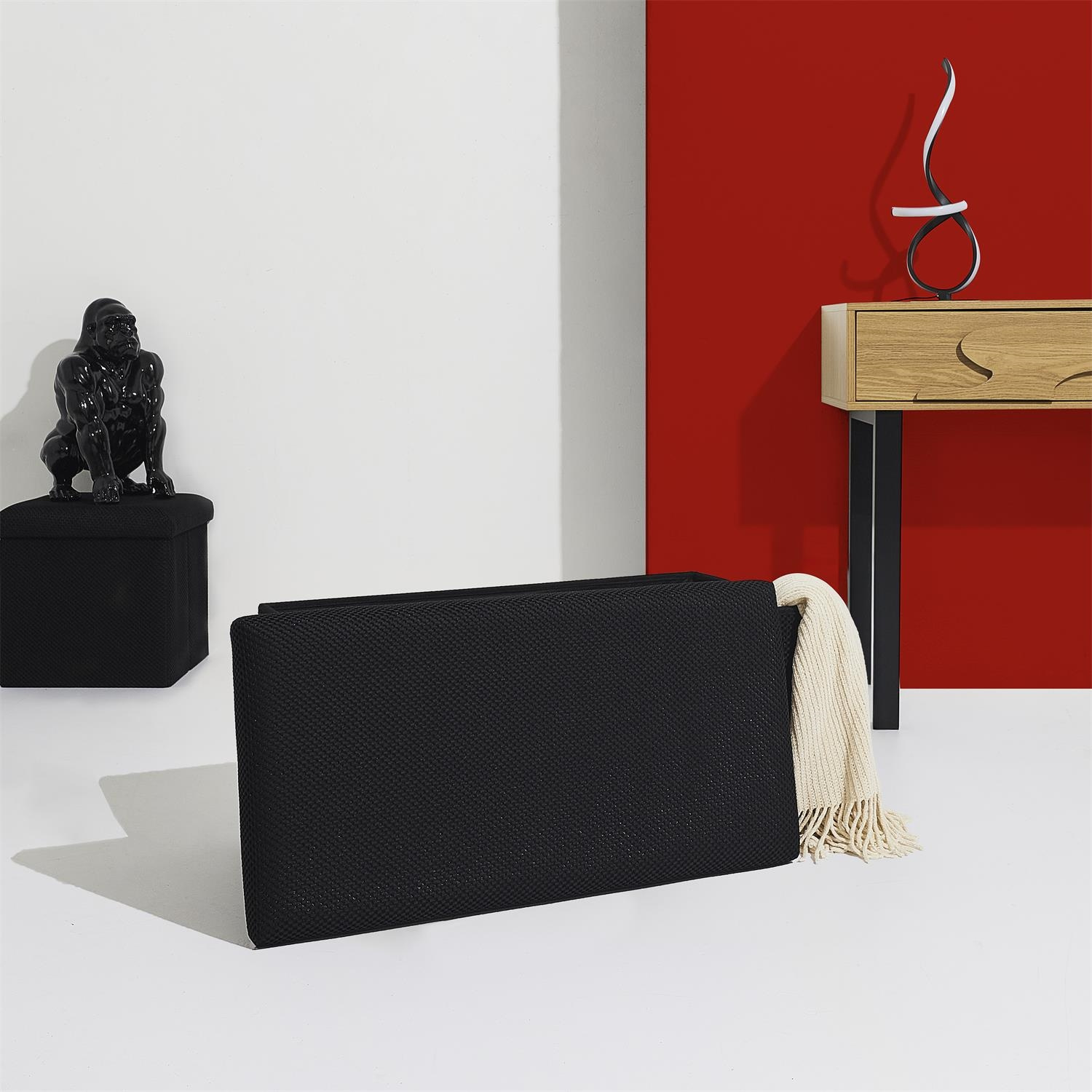 Składana pufa ze schowkiem to must have każdego mieszkania studenta lub osób, które potrzebują dodatkowego siedziska oraz miejsca do przechowywania. Pufa wykonana ze stelaża z wytrzymałej płyty MDF, która gwarantuje maksymalne dopuszczalne obciążenie mebla aż do 110kg. Pufę można złożyć gdy jej nie używamy. Po rozłożeniu natomiast daje nam sporo miejsca do przechowywania zarówno mniejszych rzeczy jak i sporych takich jak koce, buty lub książki. Pufa ozdobiona została ciekawą trójwymiarową tkaniną. Tkanina 100% poliester.Cechy produktu