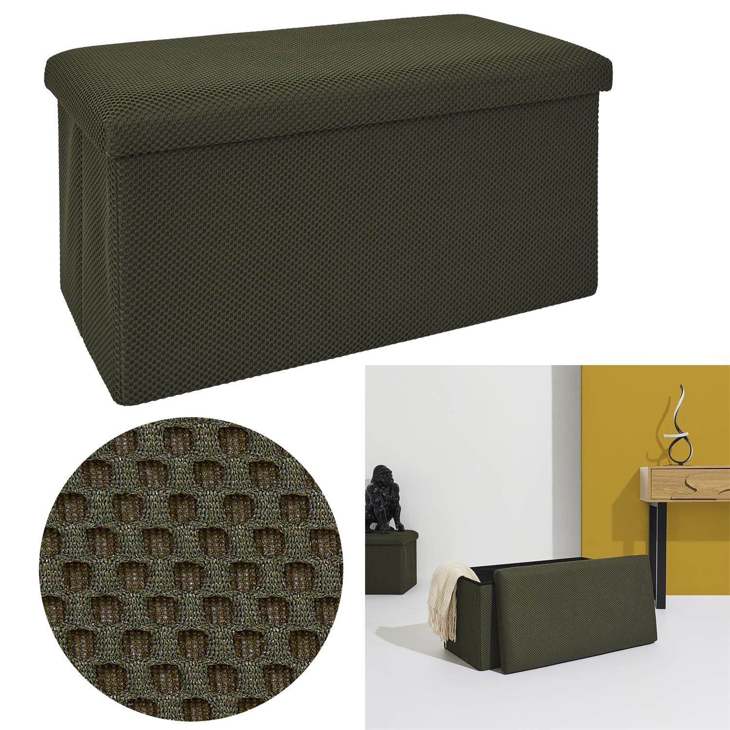 Składana pufa ze schowkiem to must have każdego mieszkania studenta lub osób, które potrzebują dodatkowego siedziska oraz miejsca do przechowywania. Pufa wykonana ze stelaża z wytrzymałej płyty MDF, która gwarantuje maksymalne dopuszczalne obciążenie mebla aż do 110kg. Pufę można złożyć gdy jej nie używamy. Po rozłożeniu natomiast daje nam sporo miejsca do przechowywania zarówno mniejszych rzeczy jak i sporych takich jak koce, buty lub książki. Pufa ozdobiona została ciekawą trójwymiarową tkaniną. Tkanina 100% poliester.Cechy produktu