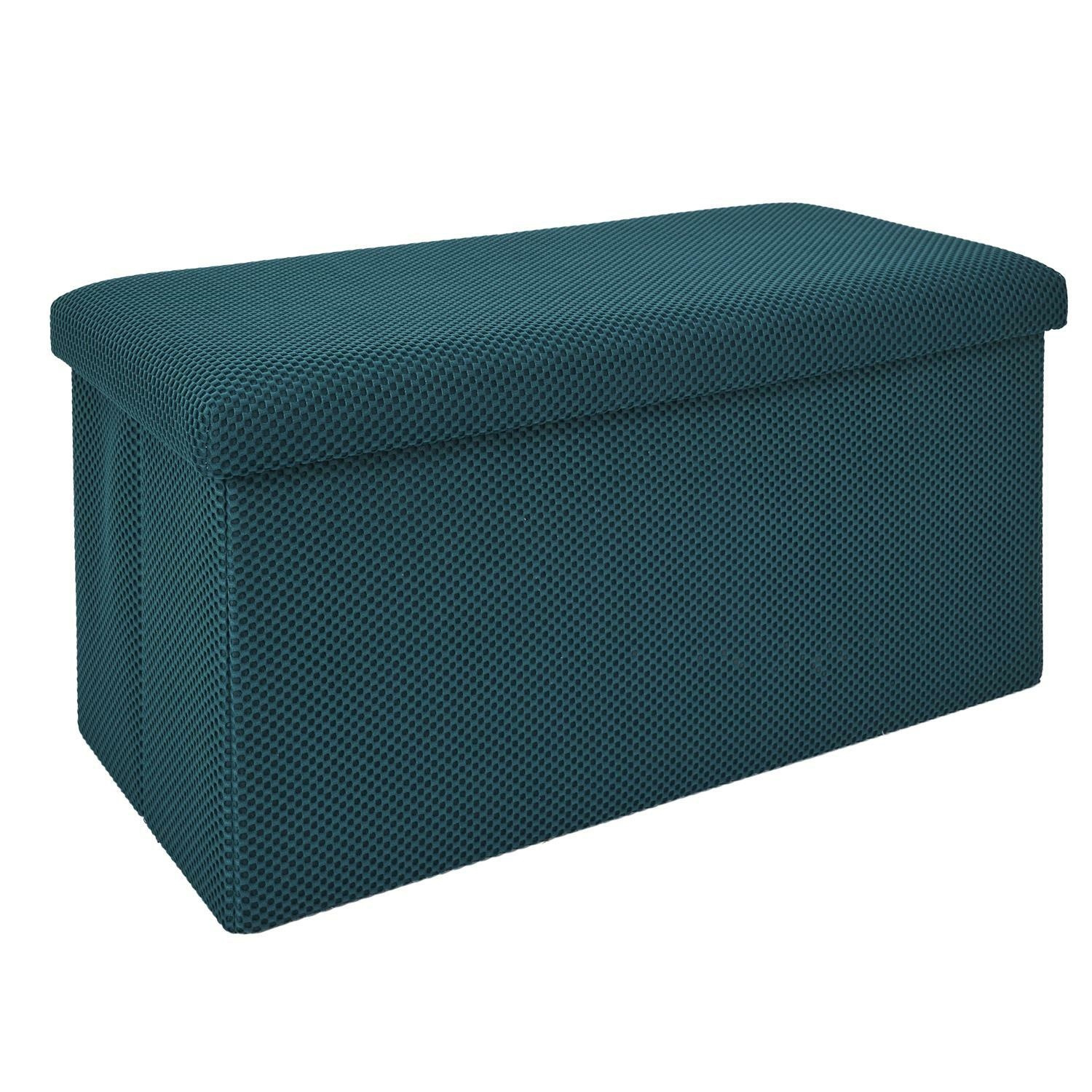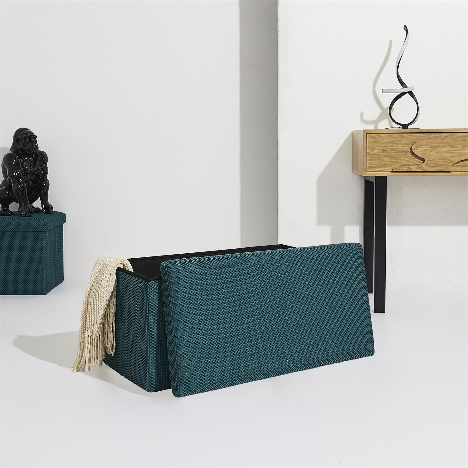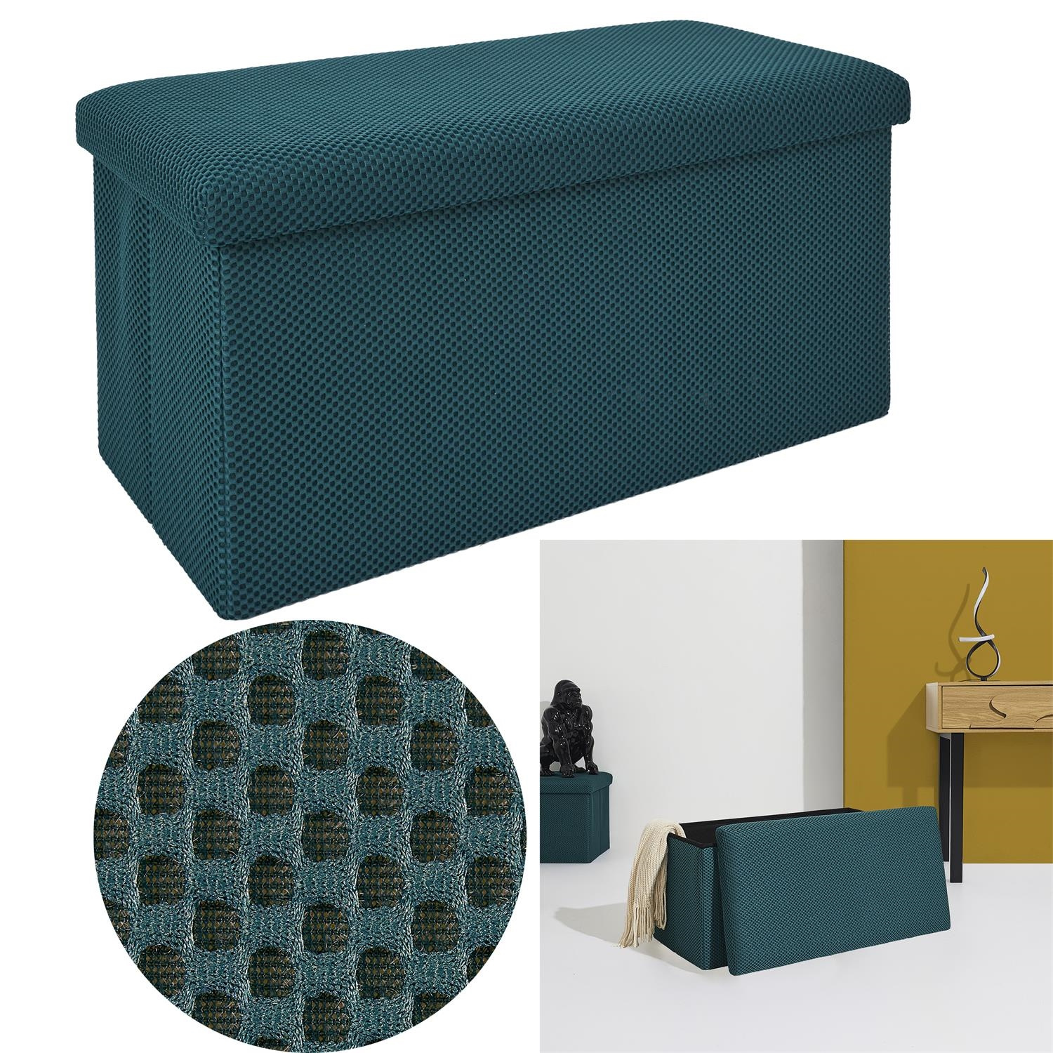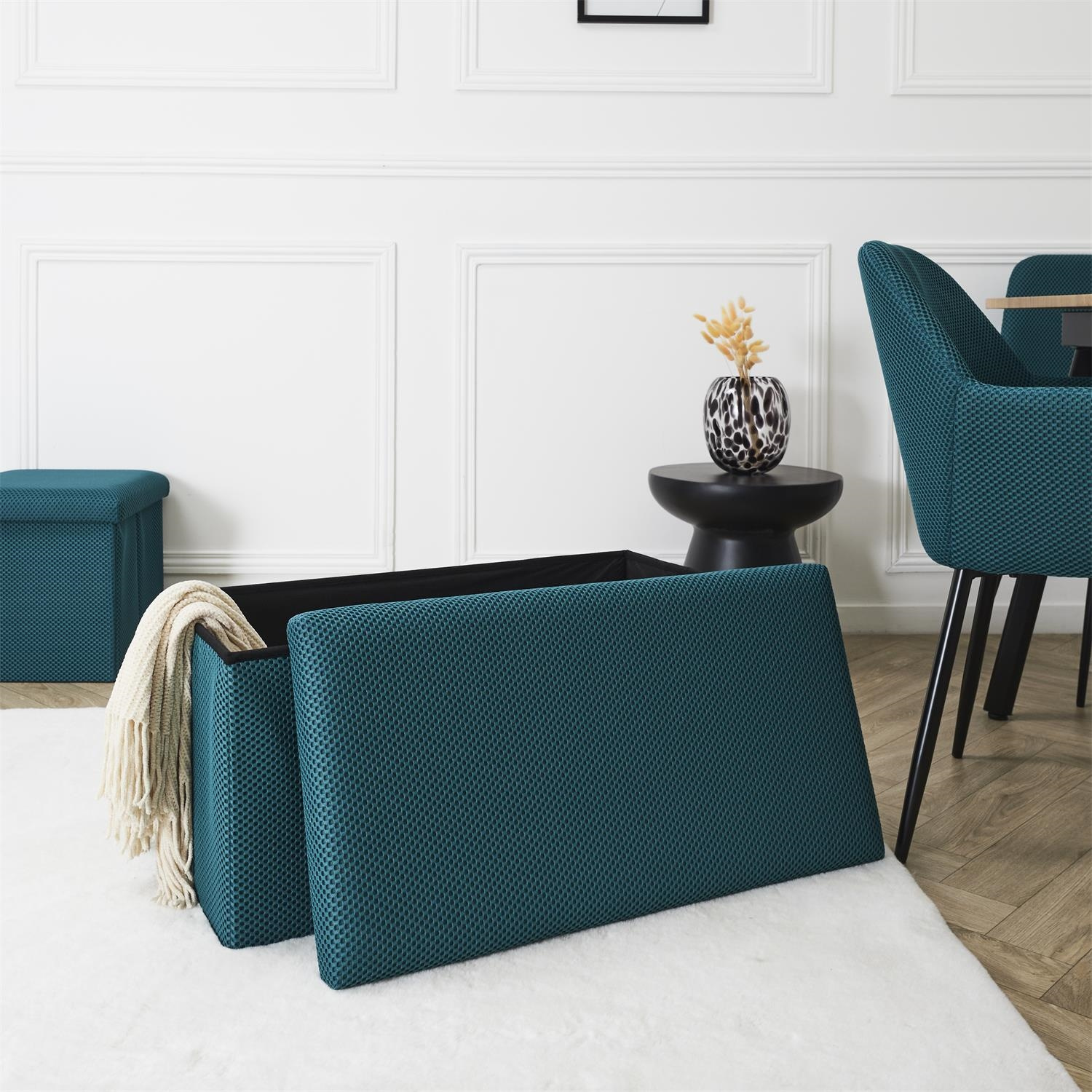 Składana pufa ze schowkiem to must have każdego mieszkania studenta lub osób, które potrzebują dodatkowego siedziska oraz miejsca do przechowywania. Pufa wykonana ze stelaża z wytrzymałej płyty MDF, która gwarantuje maksymalne dopuszczalne obciążenie mebla aż do 110kg. Pufę można złożyć gdy jej nie używamy. Po rozłożeniu natomiast daje nam sporo miejsca do przechowywania zarówno mniejszych rzeczy jak i sporych takich jak koce, buty lub książki. Pufa ozdobiona została ciekawą trójwymiarową tkaniną. Tkanina 100% poliester.Cechy produktu