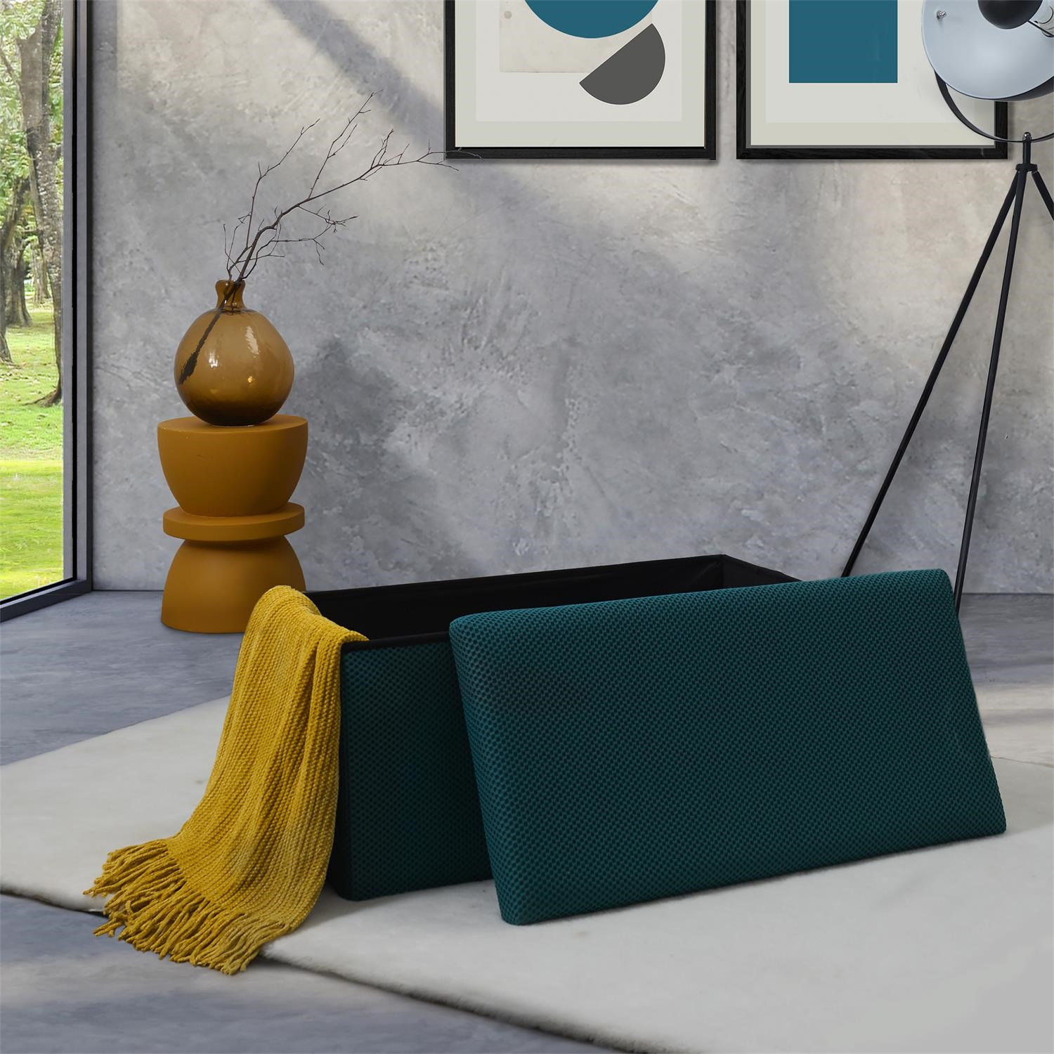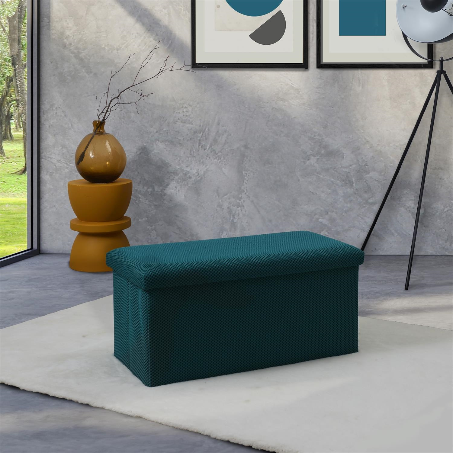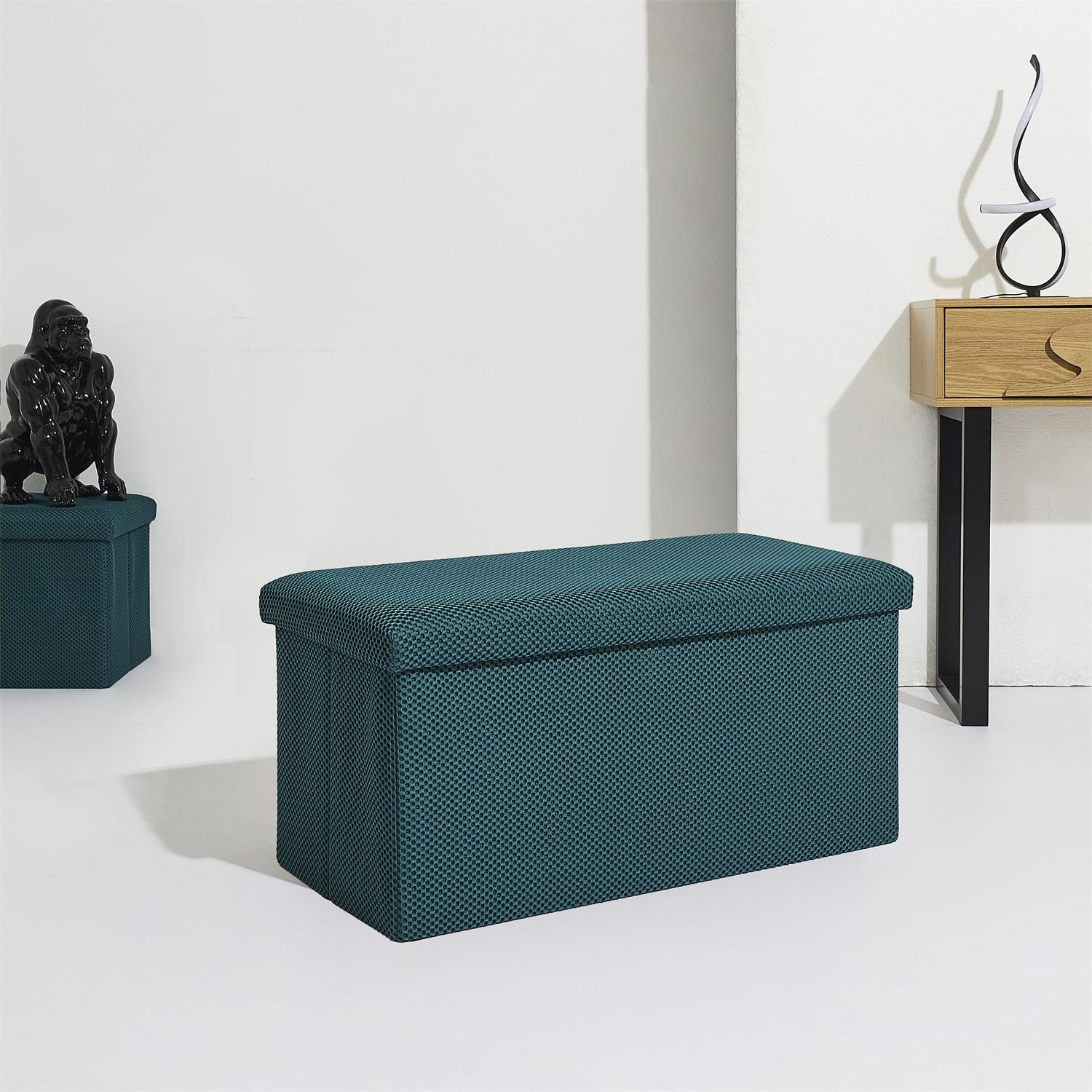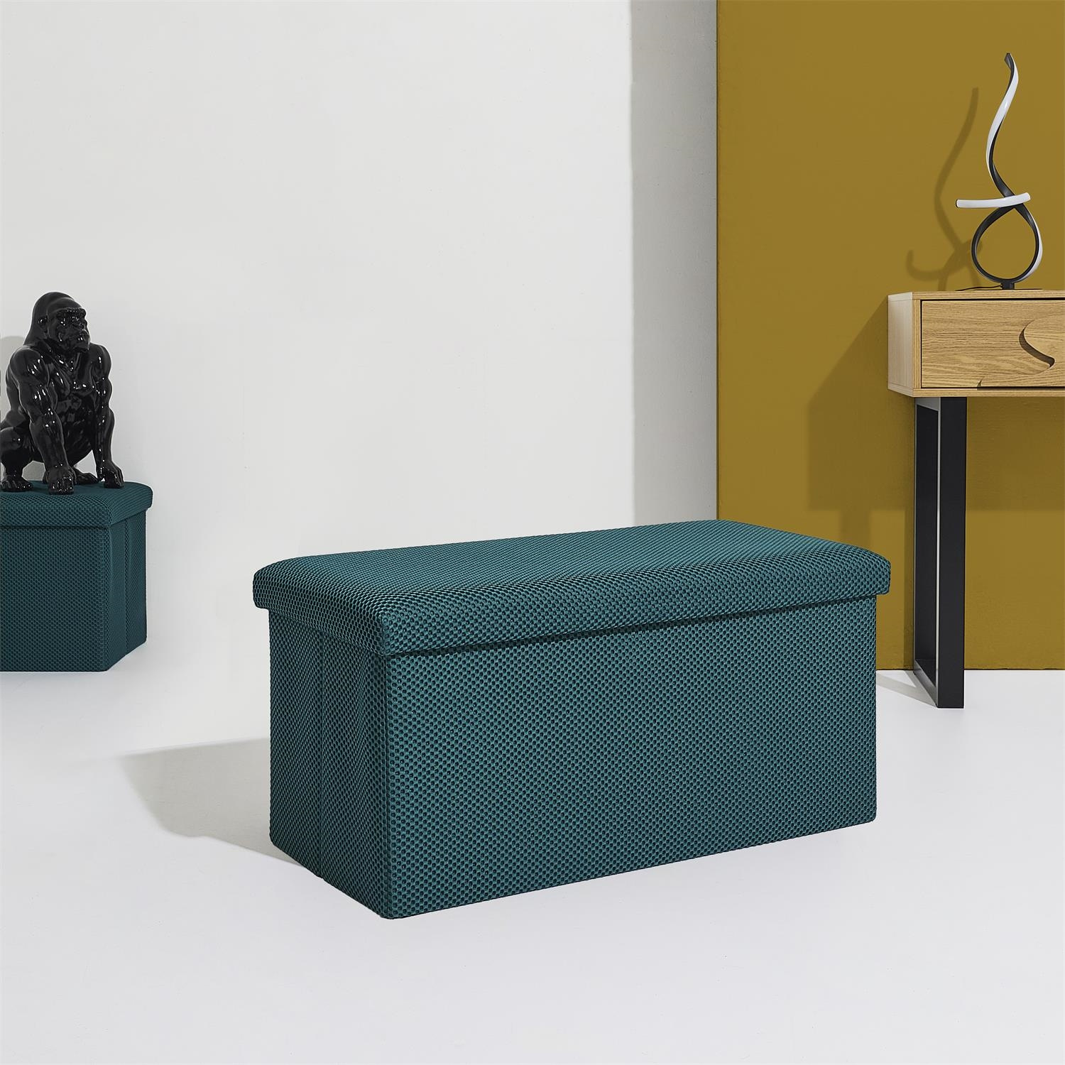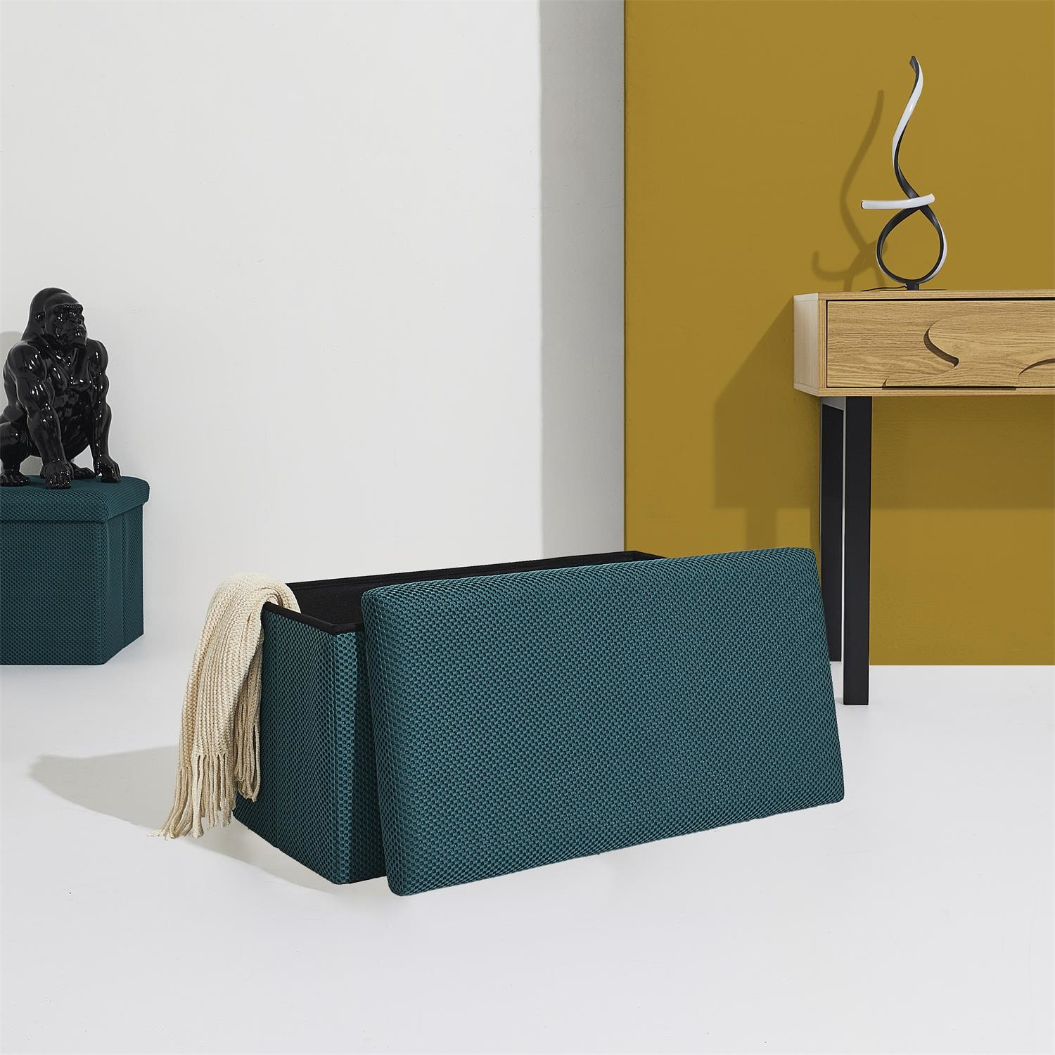 Składana pufa ze schowkiem to must have każdego mieszkania studenta lub osób, które potrzebują dodatkowego siedziska oraz miejsca do przechowywania. Pufa wykonana ze stelaża z wytrzymałej płyty MDF, która gwarantuje maksymalne dopuszczalne obciążenie mebla aż do 110kg. Pufę można złożyć gdy jej nie używamy. Po rozłożeniu natomiast daje nam sporo miejsca do przechowywania zarówno mniejszych rzeczy jak i sporych takich jak koce, buty lub książki. Pufa ozdobiona została ciekawą trójwymiarową tkaniną. Tkanina 100% poliester.Cechy produktu