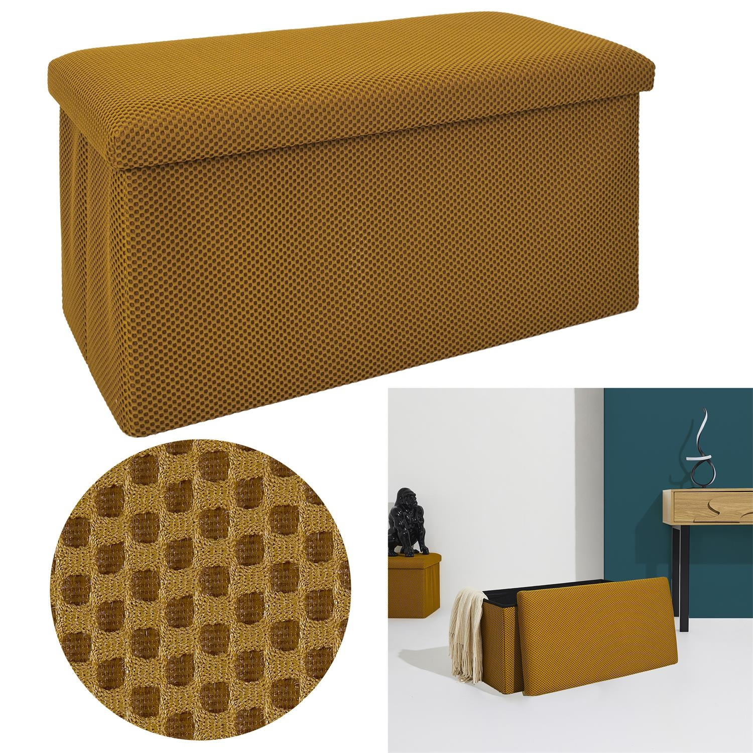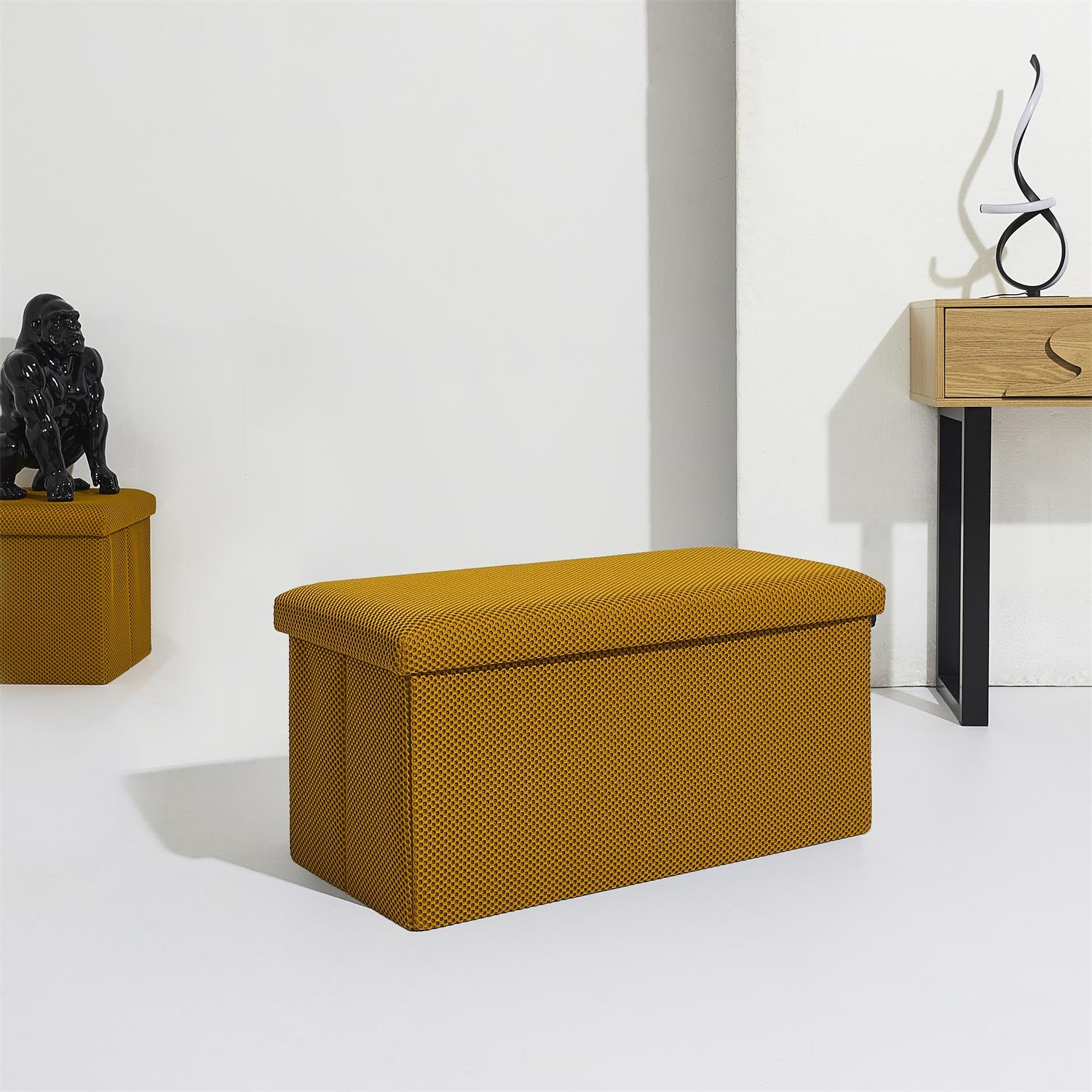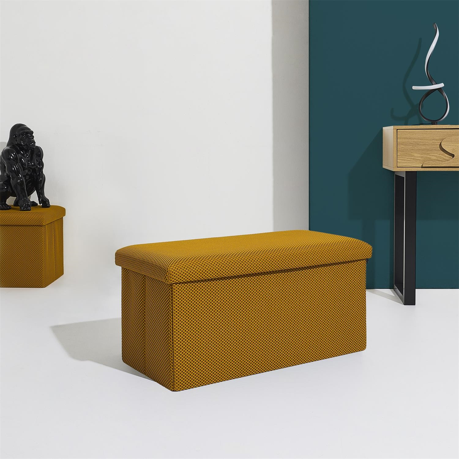 Składana pufa ze schowkiem to must have każdego mieszkania studenta lub osób, które potrzebują dodatkowego siedziska oraz miejsca do przechowywania. Pufa wykonana ze stelaża z wytrzymałej płyty MDF, która gwarantuje maksymalne dopuszczalne obciążenie mebla aż do 110kg. Pufę można złożyć gdy jej nie używamy. Po rozłożeniu natomiast daje nam sporo miejsca do przechowywania zarówno mniejszych rzeczy jak i sporych takich jak koce, buty lub książki. Pufa ozdobiona została ciekawą trójwymiarową tkaniną. Tkanina 100% poliester.