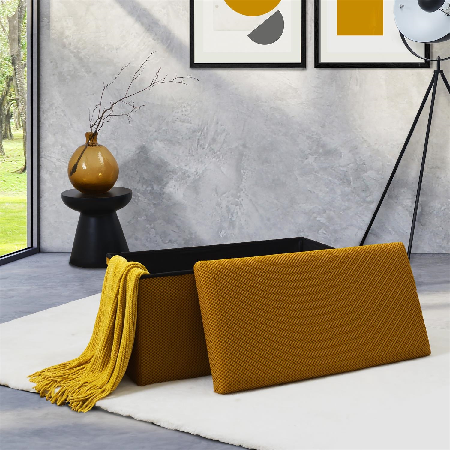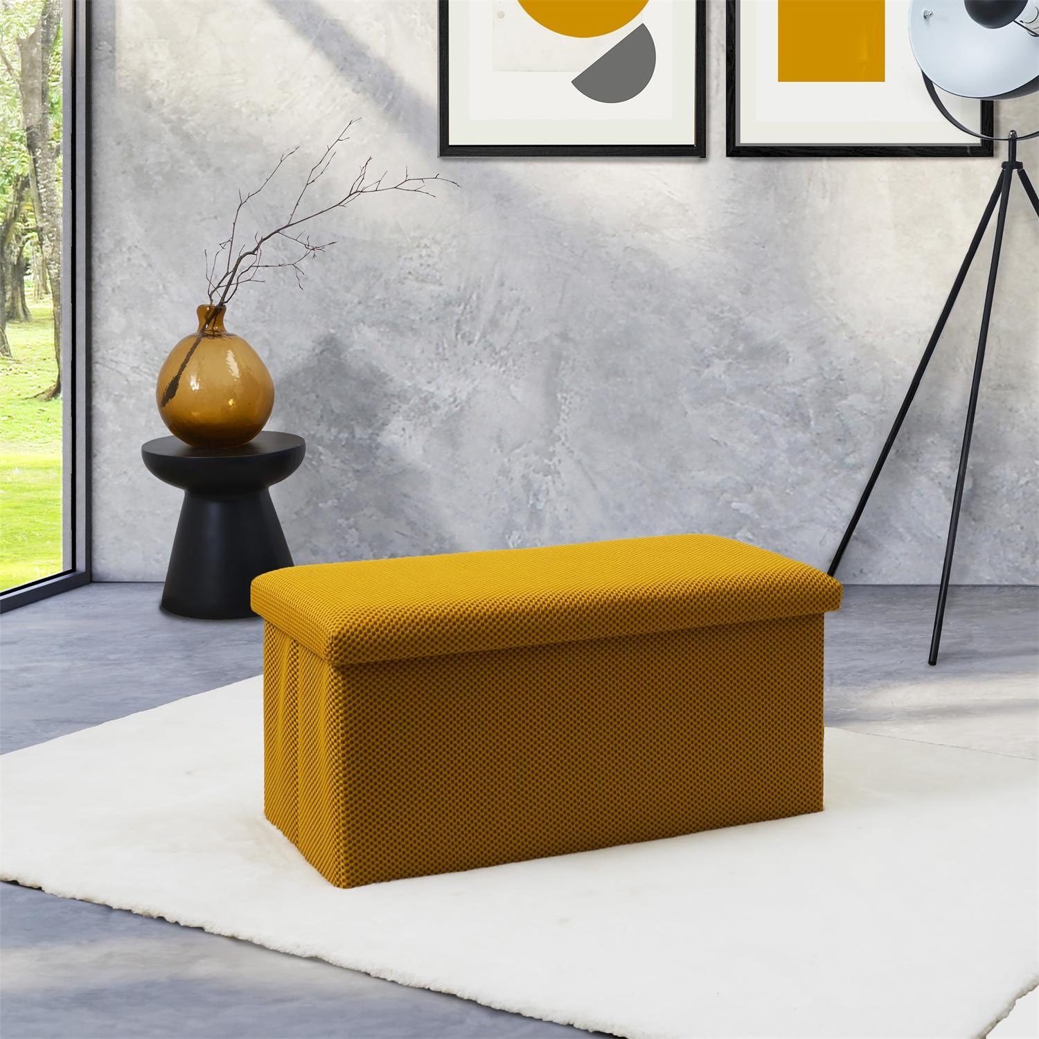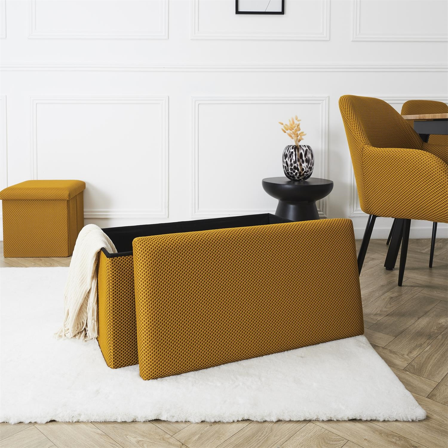 Składana pufa ze schowkiem to must have każdego mieszkania studenta lub osób, które potrzebują dodatkowego siedziska oraz miejsca do przechowywania. Pufa wykonana ze stelaża z wytrzymałej płyty MDF, która gwarantuje maksymalne dopuszczalne obciążenie mebla aż do 110kg. Pufę można złożyć gdy jej nie używamy. Po rozłożeniu natomiast daje nam sporo miejsca do przechowywania zarówno mniejszych rzeczy jak i sporych takich jak koce, buty lub książki. Pufa ozdobiona została ciekawą trójwymiarową tkaniną. Tkanina 100% poliester.
