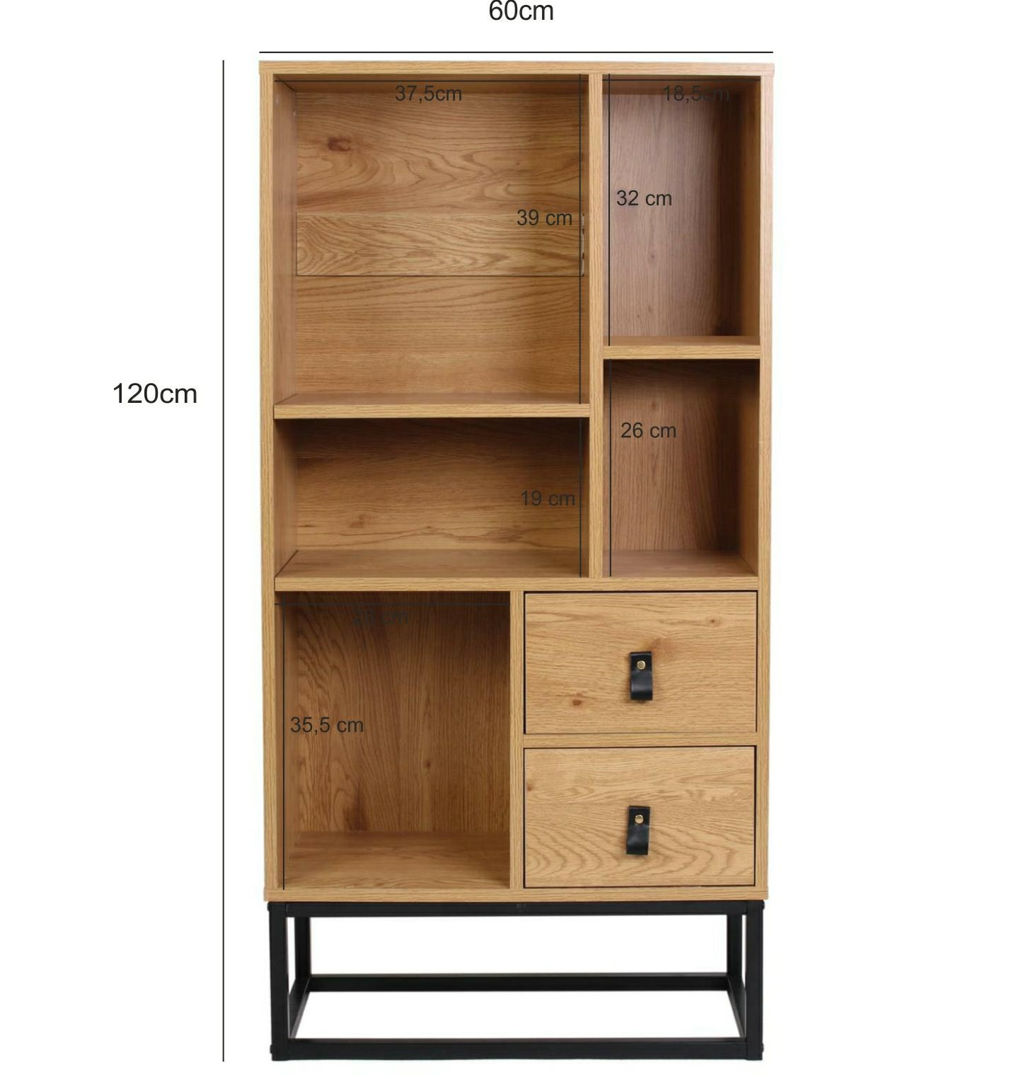 Wysoki regał Abbott to doskonały pomysł wszędzie tam, gdzie trzeba pomieścić wiele drobiazgów. Idealny na książki, domowe pamiątki, zdjęcia lub inne, potrzebne pod ręką przedmioty. Regał dzięki swojej nietypowej budowie ma 5 pojemnych półek o różnych wielkościach. U dołu dwie głębokie, pojemne szuflady z uchwytami z ciemnej eko skóry. Dzięki temu regał zyskuje nowoczesny szlif i oryginalną formę. Górę wieńczy gładki blat. Regał zaprojektowano z myślą o wieloletnim użytkowaniu. Powstał z wytrzymałej płyty laminowanej w kolorze dębu. Środek regału to płyta w kolorze imitującym drewno. Całość opiera się na solidnym, metalowym malowanym proszkowo stelażu. Waga regału: 22kg Max ilość szt. w kartonie: 1 Wymiary kartonu: 98cm x 30cm x 18cmCechy produktu