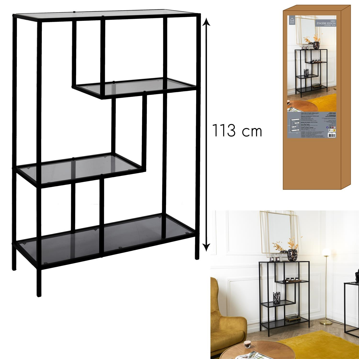 - Regał Edison to połączenie czarnej metalowej konstrukcji ze szklanymi półkami o dymionym odcieniu. Hartowane szkło półek regału jest nie tylko bezpiecznym mateirałem ale również łatwym w utrzymaniu w czystości. Regał o niesymetrycznej budowie jest nie tyl