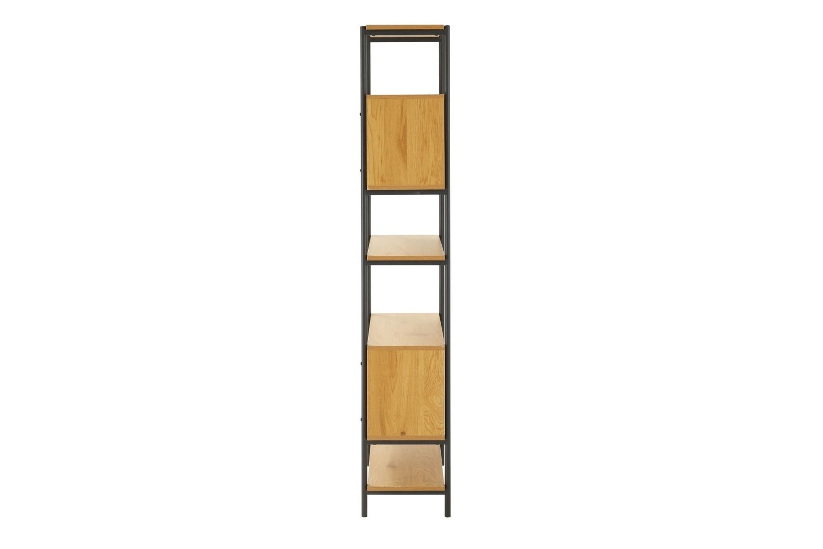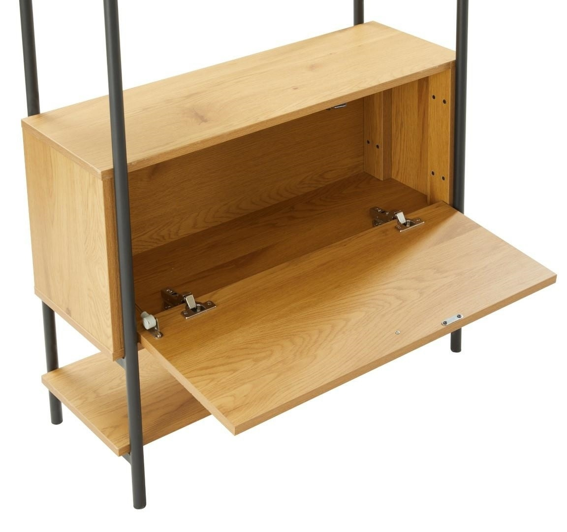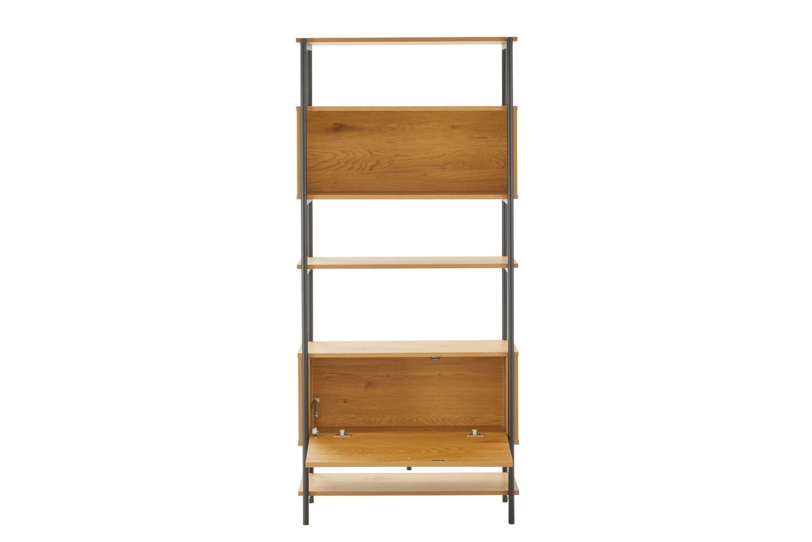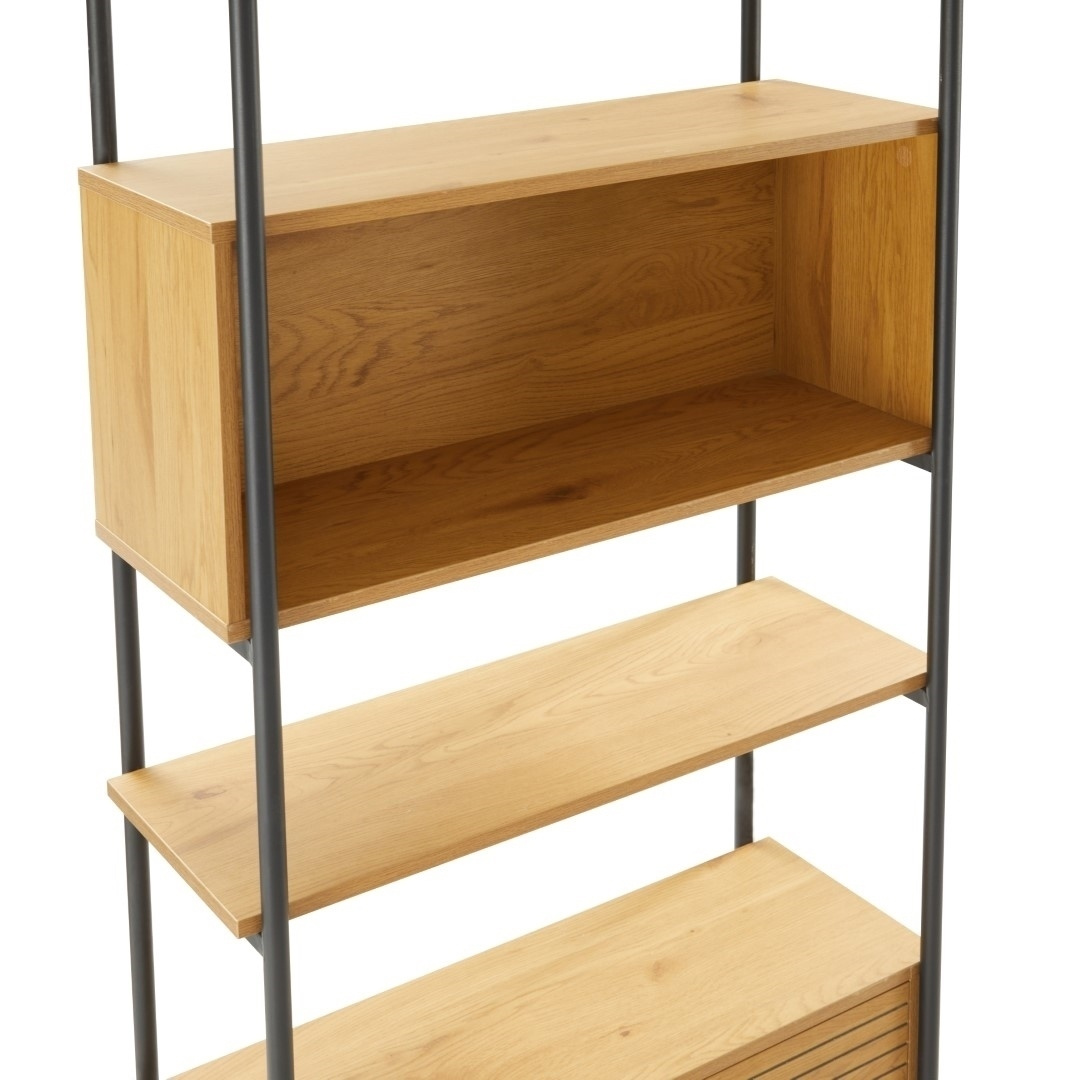 Wysoki regał w stylu vintage to idealne połączenie funkcjonalności i elegancji. Wyposażony w szafkę z zamykanym frontem oraz półki, oferuje dużo miejsca na przechowywanie różnorodnych przedmiotów. Czarne, metalowe podstawy dodają mu industrialnego charakteru, podkreślając jego wyjątkowy design. Doskonały wybór dla miłośników klasycznych i stylowych wnętrz. Metalowa rama malowana proszkowo na czarno. Półki i fronty wykonane z MDF z okleiną imitującą dąb Regał: 5 półek i szafka Wymaga montażu