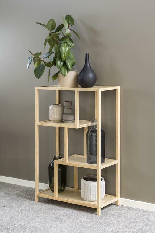 - Regał Moso, wykonany w całości z bambusa, zapewnia delikatną estetykę, ale także trwałość. Dzięki asymetrycznym detalom ten regał jest jednym z tych, na które warto zwrócić uwagę. Oferuje 2 półki, na których można wyeksponować ulubione przedmioty i dekora
