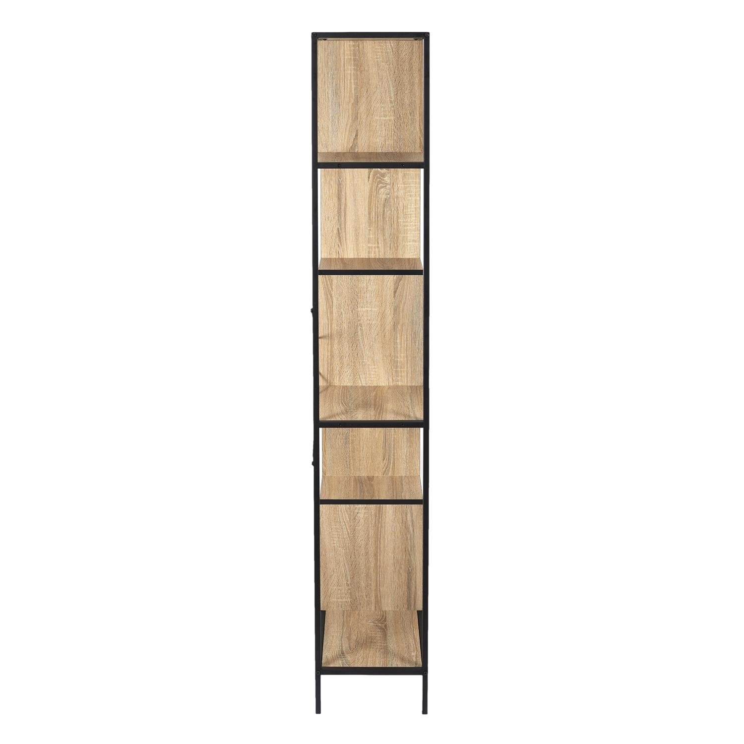 Loftowy regał Rack w najwyższej wersji to idealny mebel do nowoczesnego salonu. Nieregularne półki o nietypowym kształcie będą nie tylko dobrym miejscem na przechowywanie, ale również są designerską konstrukcją, która doda loftowego wyrazu salonowi lub pokoju nastolatka. Półki regału to płyta MDF ozdobiona okleiną imitującą drewno. Brzegi półek oraz podstawa regału komponują się ze sobą, dzięki pomalowaniu ich na czarno. Regał został wzmocniony metalowymi poprzeczkami, które krzyżują się w jego tylnej części. Ciekawym rozwiązaniem są pionowe ścianki regału, które również wykonane zostały z płyty MDF. Waga: 22 kg Wymiary opakowania: 37x20x102cmCechy produktu