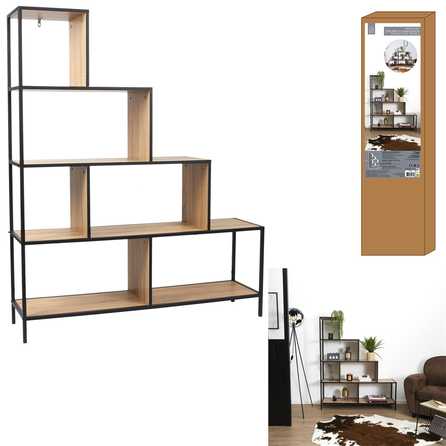 Schodkowy regał to przede wszystkim inspirujący mebel na nasza biblioteczkę. Regał o nieregularnym kształcie sam w sobie dodaje stylu we wnętrzu. Regał wykonany został z metalu malowanego proszkowo na czarno oraz półek z płyty MDF w okleinie imitującej dąb. Max. obciżenie na półkę 5kg Wymaga montażu. Wymiary kartonu: 37x12x109cm Waga 11kgCechy produktu