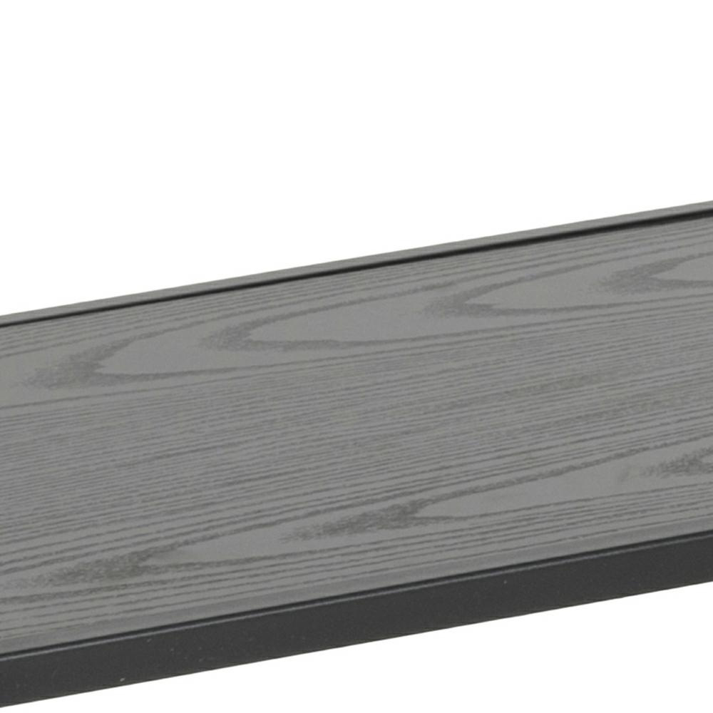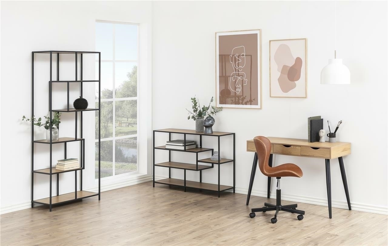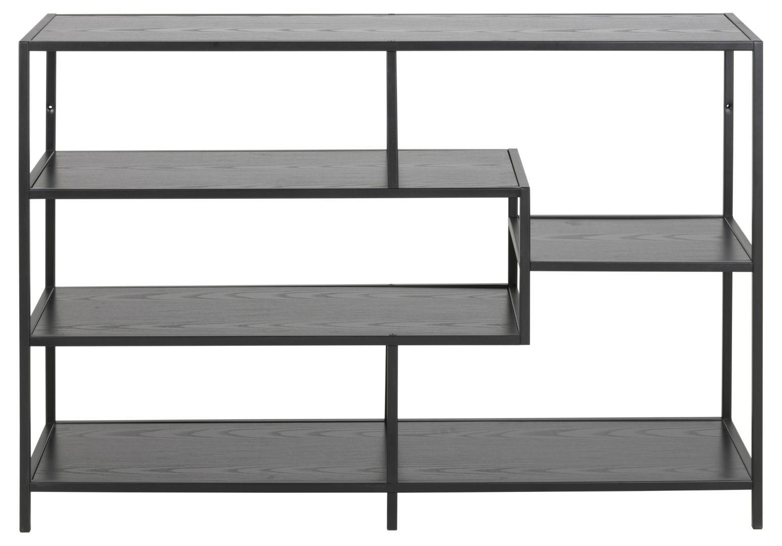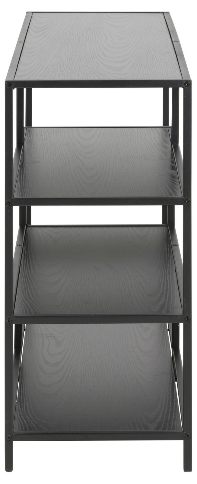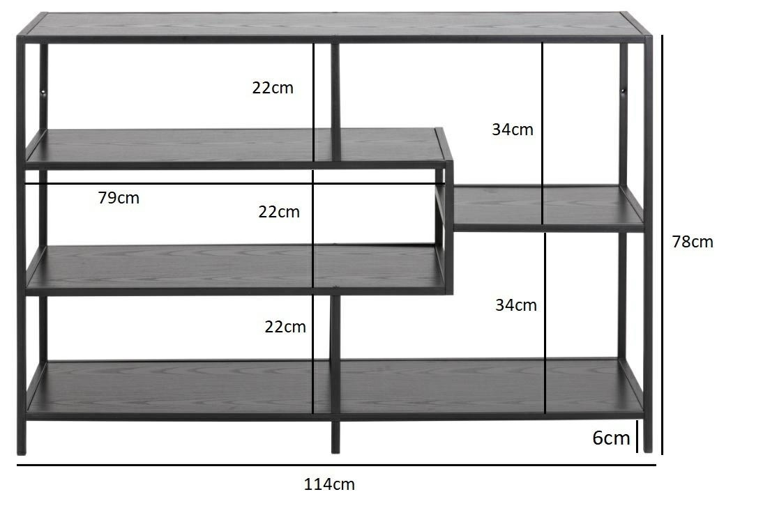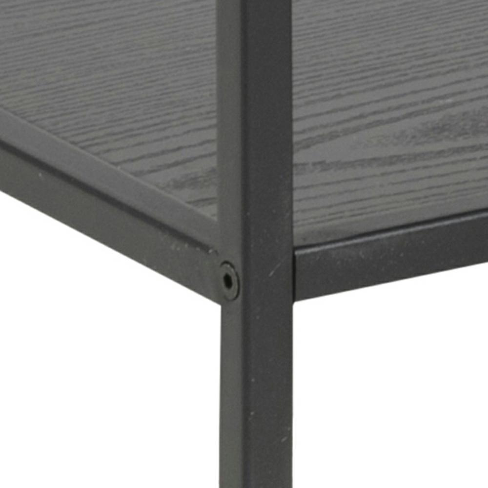 Regał Seaford został zrobiony z wytrzymałego metalowego szkieletu oraz trzech mniejszych i dwóch większych półek z MDF oklejonych okleiną. Metalowa konstrukcja została pomalowana proszkowo na czarno. Jej matowe wykończenie nadaje całości elegancji. Czarna okleina na półkach idealnie współgra z czarnym kolorem konstrukcji. Regał stoi na niewysokich nóżkach. Waga: 17,9 kg. Wymiary kartonu: 14cm x 117cm x 38cmCechy produktu