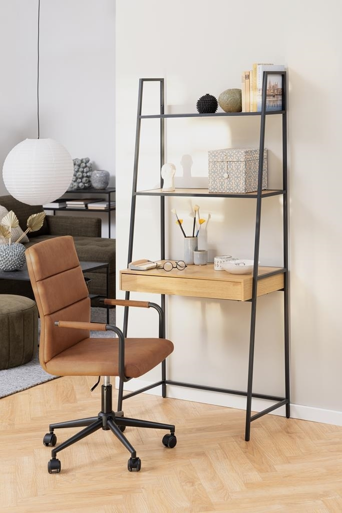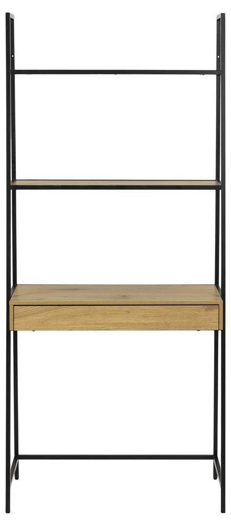 Regał z szufladą Seaford to mebel w formie drabinki. Posiada szkielet wykonany z metalu malowanego proszkowo na kolor czarny. Regał opiera się na czterech nóżkach zakończonych specjalnymi nakładkami. Jego zaletą są dwie szerokie półki z płyty MDF w okleinie dębowej. Regał Seaford posiada także głęboką szufladę, któa może jednocześnie stanowić blat roboczy. To multifunkcjonalny mebel pasujący zarówno do gabinetu jak i sypialni. Ilość kartonów: 1 Wymiary kartonów: 180x39,5x8,3cm Waga kartonów: 16,3kg