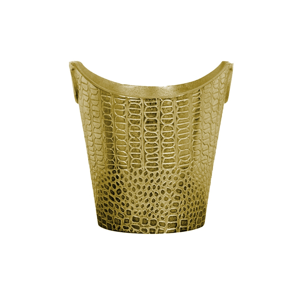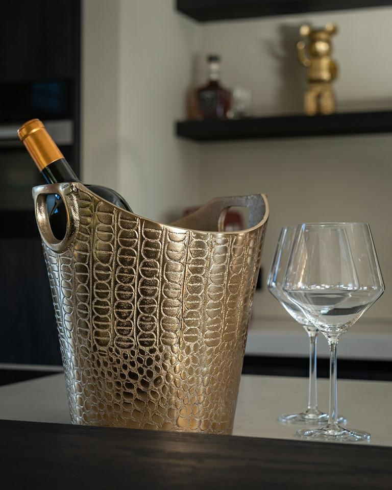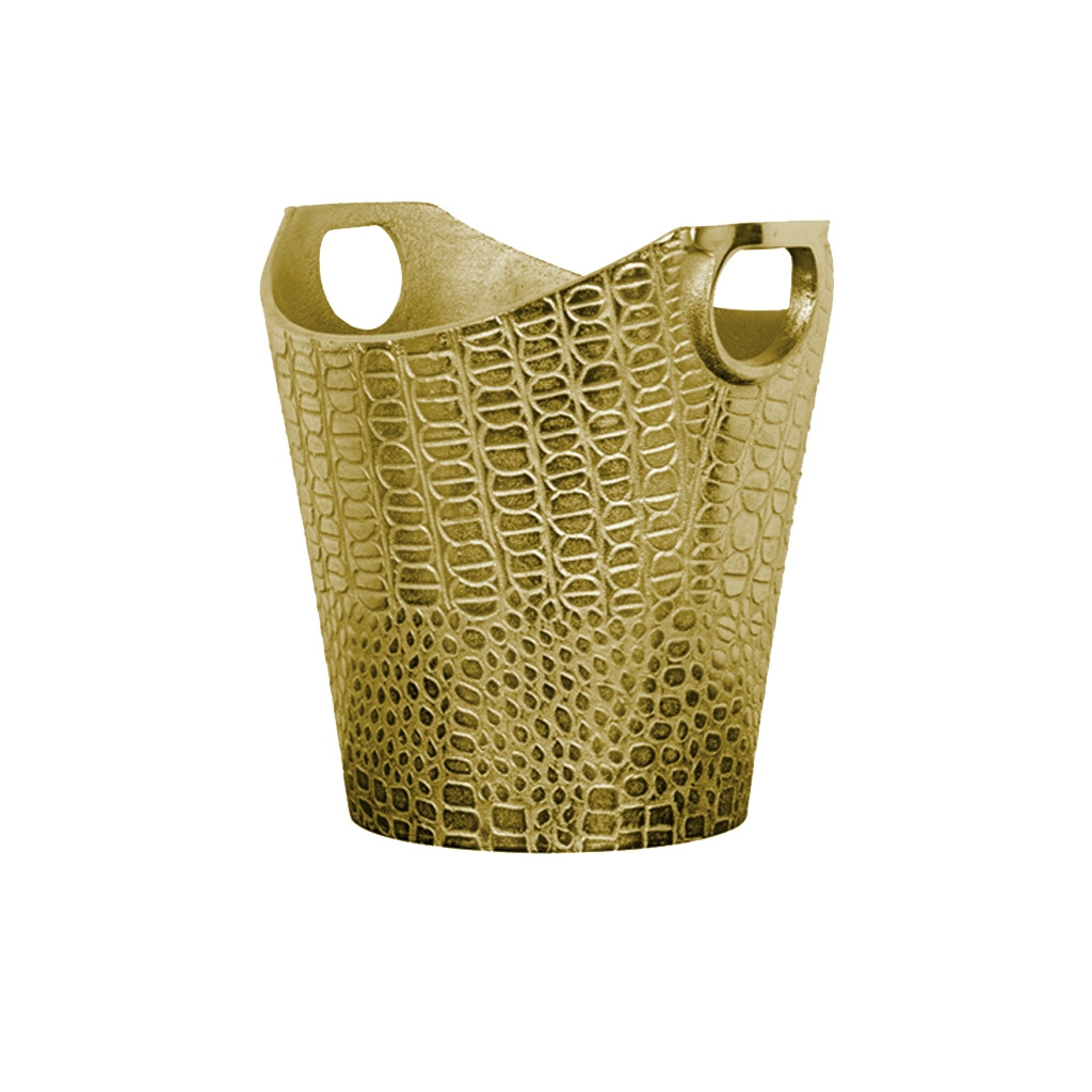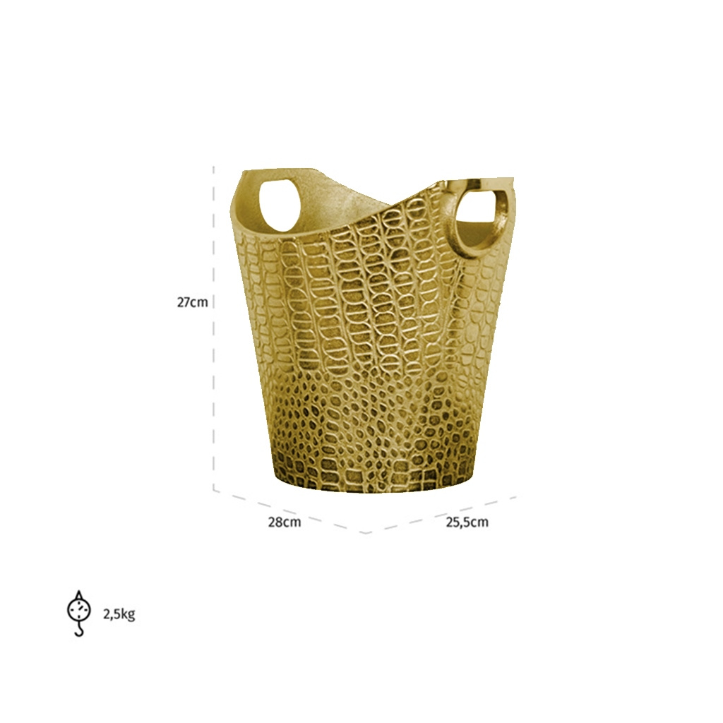RICHMOND chłodziarka ASHLY. Ten efektowny cooler do wina w formą przypomina metalowy kosz z uchwytami. Charakterystycznym elementem ozdobnym jest motyw krokodylej skóry. Chłodziarkę wykonano z wysokiej jakości stopu aluminium, zatem sprawdzi się nie tylko jako dekoracja, ale również jako praktyczne domowe akcesorium. Dostępna także srebrna wersja. Wymiary: wys. 27 cm / szer. 28 cm / gł. 25,5 cm Waga brutto: 2,5 kg.Cechy produktu