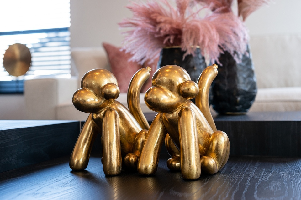 - RICHMOND dekoracja MONKEY złota. Figurka Monkey marki Richmond Interiors imituje małpkę w eleganckim, bogatym złotym kolorze. Wykonana jest w całości z wysokiej jakości żywicy. Jest to rodzaj materiału, który charakteryzuje się mocnym, solidnym wykończeni