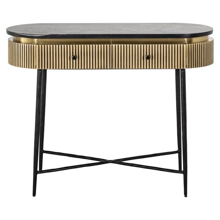 Kolekcja IRONVILLE to arystokracja zaklęta w nowoczesnych formach. Najlepiej zaprezentuje się w przestronnych pomieszczeniach. Każdy mebel został bardzo starannie wykonany z materiałów wysokiej jakości. W połączeniu z pięknym światłem metalowe akcenty rozjaśnią każdą przestrzeń. Czerń i odcienie złota to przepis na wnętrze z charakterem. Konsola IRONVILLE to nie tylko użyteczny element wyposażenia, to również elegancka ozdoba wnętrza. Piękny blat wykonano z grubego, czarnego marmuru i wzbogacono mosiężnym korpusem. Wbudowane dwie wysuwane szuflady dodają całości praktyczności. Podwyższoną podstawę wykonano z czarnego metalu. Doskonale sprawdzi się również jako toaletka do makijażu. Polecamy zapoznać się z całą wyjątkową kolekcją. Wymiary: wys. 76 cm / szer. 100 cm / gł. 40 cm Waga brutto: 64,4 kg.Cechy produktu