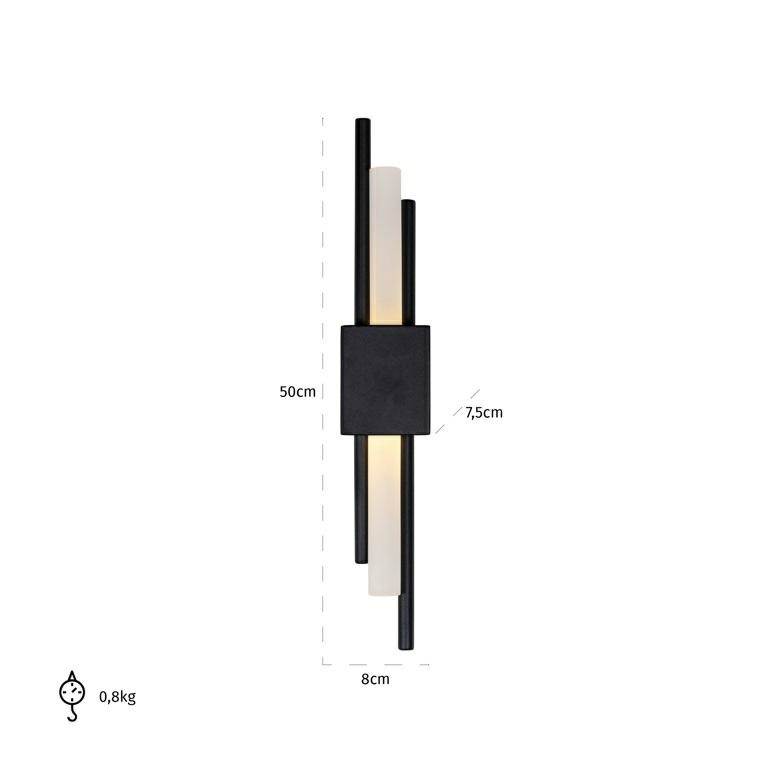RICHMOND lampa ścienna MYLAS czarna. Metalowa lampa ścienna Mylas od producenta Richmond Interiors to idealny dodatek, który doda odrobinę luksusu i oryginalności do Twojego wnętrza. Teksturowany metal w połączeniu z warstwą akrylu pokrywającą lampę tworzą wyjątkowy akcent o industrialnym wyglądzie. Jest to idealna lampa do umieszczenia w sypialni lub do wzmocnienia oświetlenia korytarzy i stworzenia relaksującego klimatu. Dostępna również wersja w złotym kolorze. Światło: LED 5 W (ściemnialny) / 300 lm / 3000 K Oprawa: wys. 50 cm / szer. 8 cm / gł. 7,5 cm Montaż: instalacja ścienna Waga netto: 0,8 kg.Cechy produktu
