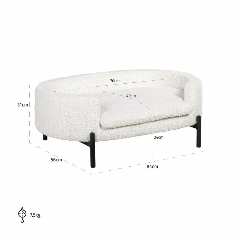 RICHMOND legowisko dla psa DOLLY białe. Wyjątkowe legowisko dla psa wykonane z białej tkaniny poliestrowej, które zachwyca swoimi opływowymi i wygodnymi kształtami. Minimalistyczne czarne nóżki ze stali podkreślają elegancję i nowoczesny design legowiska. Oprócz bieli dostępne są również inne kolory, dzięki czemu można dopasować je do wystroju wnętrza. Dolly nie tylko zapewni pupilkowi wygodne miejsce wypoczynku, ale również stanie się stylowym dodatkiem do każdego wnętrza. Wymiary: wys. 31 cm / szer. 84 cm / gł. 56 cm Waga brutto: 9 kg.Cechy produktu