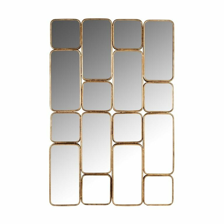 RICHMOND lustro ścienne BIRCHE złote. Birche to lustro składające się z 16 połączonych ze sobą prostokątnych i kwadratowych luster w złotych eleganckich ramach. Całość tworzy nowoczesny, a zarazem ciekawy design, który sprawdzi się w wielu wnętrzach. Stworzone zostało z połączenia płyty MDF z metalową ramą w kolorze złota. Briche to nie tylko lustro, to także piękna, luksusowa ozdoba w Twoim domu. Wymiary: wys. 108,5 cm / szer. 73 cm / gł. 4,5 cm Waga brutto: 13,2 kg.