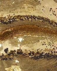 • RICHMOND obraz DONJA złoty. Zmysłowa, dekoracyjna rzeźba przedstawiająca usta, wykonana z polyresinu i zdobiona ręcznie rzeźbionymi mozaikami szklanymi. Całość pokryta jest lśniącymi, złotymi kafelkami, które przypominają efekt dyskotekowej kuli, odbijają
