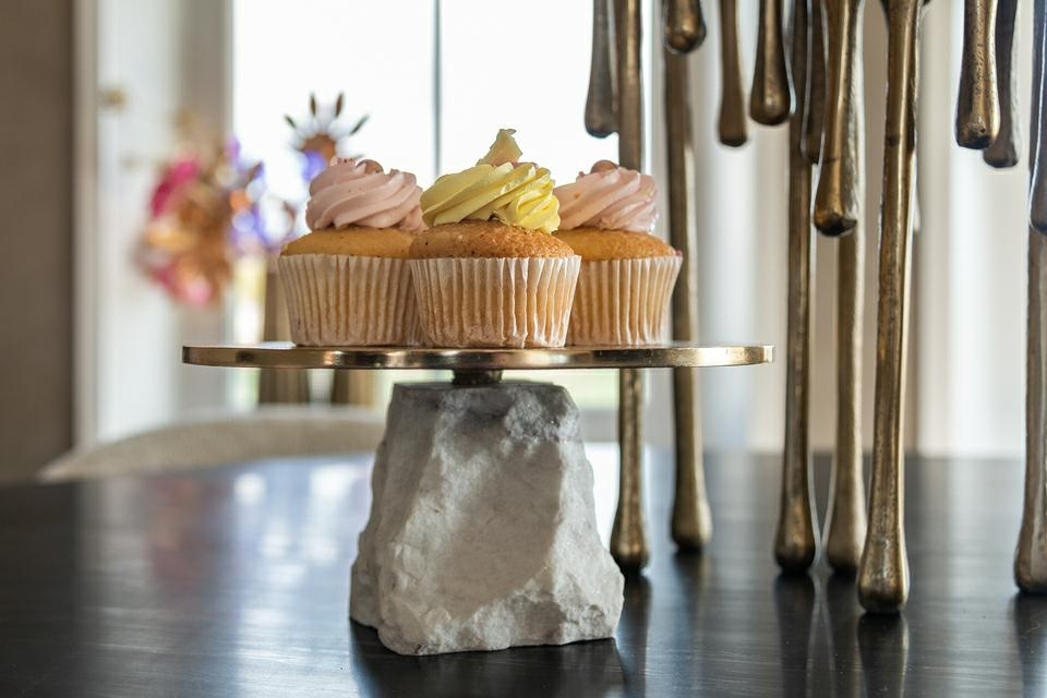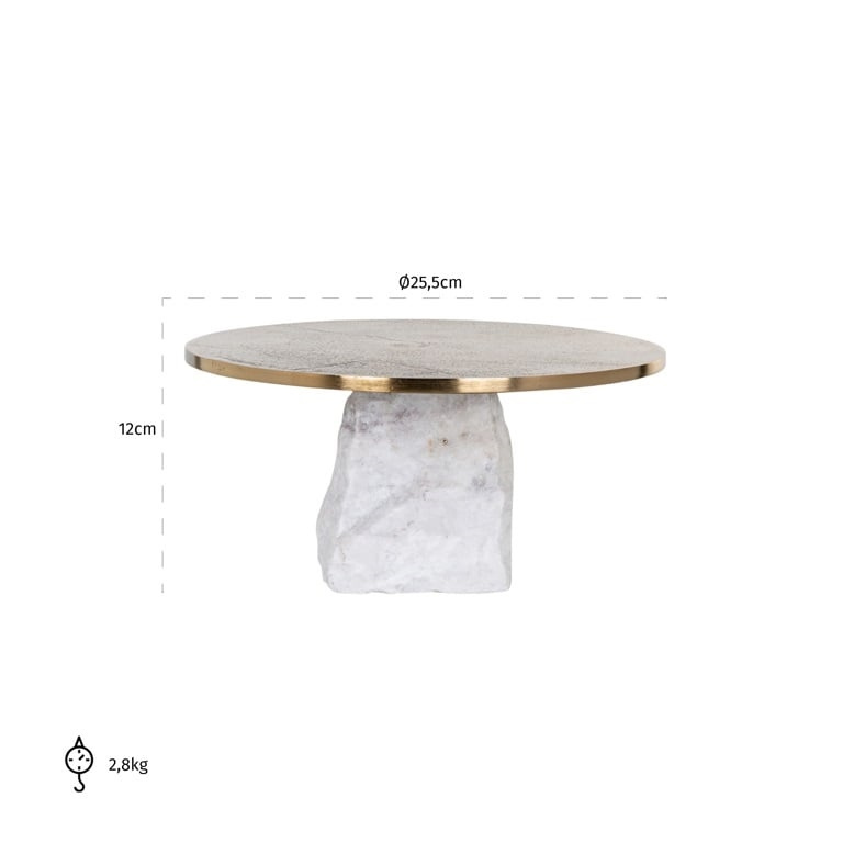 RICHMOND patera na ciasto CELILE. Gustowna i elegancka patera na ciasto Celile marki Richmond Interiors jest po prostu czymś pięknym. Okrągły talerzyk z aluminium w wykończeniu w kolorze postarzanego złota z naturalnymi teksturami znajduje się na marmurowej podstawie. Celile to marzenie wszystkich miłośników słodkości i tych, którzy uwielbiają otaczać się wspaniałymi przedmiotami. Dostępna także w ciemnym, brudnym różu. Wymiary: wys. 12 cm / szer. 25,5 cm / gł. 25,5 cm Waga netto: 2,8 kg.Cechy produktu