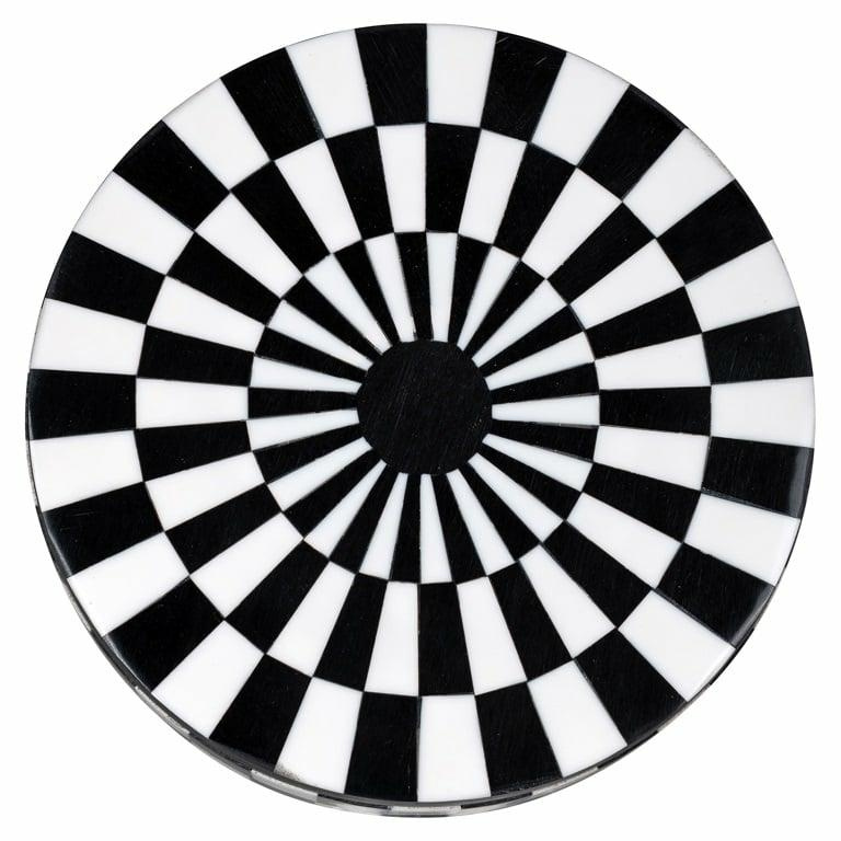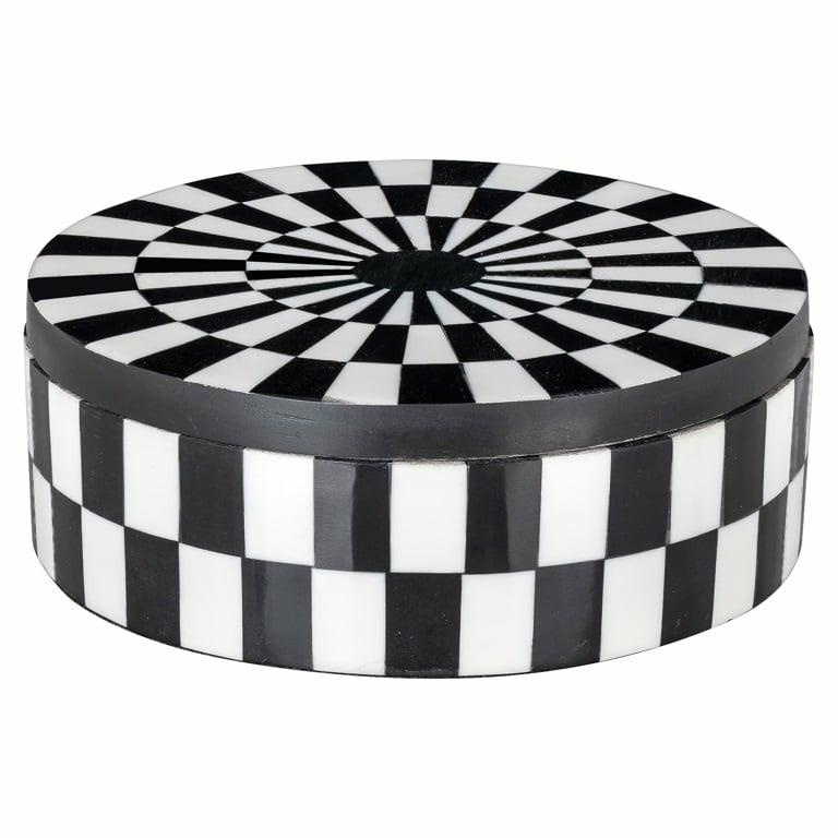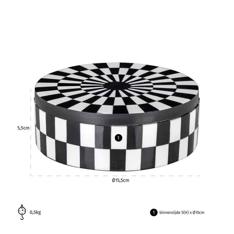 RICHMOND pojemnik dekoracyjny NORE charakteryzuje luksusowy i nowoczesny wygląd. Składa się z okrągłego pojemnika wykonanego z metalu oraz żywicy. Całość ozdobiono geometrycznym wzorami w kolorystyce biało-czarnej. Nore to wspaniały sposób na przechowanie Twoich ulubionych rzeczy oraz udekorowanie wnętrza. Wymiary: wys. 5,5 cm / szer. 11,5 cm / gł. 11,5 cm Waga netto: 0,5 kg.Cechy produktu
