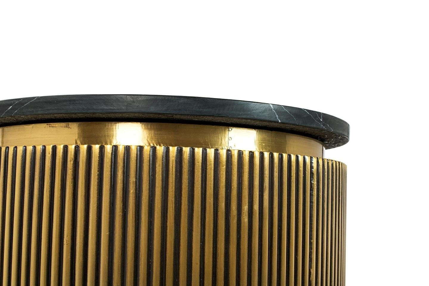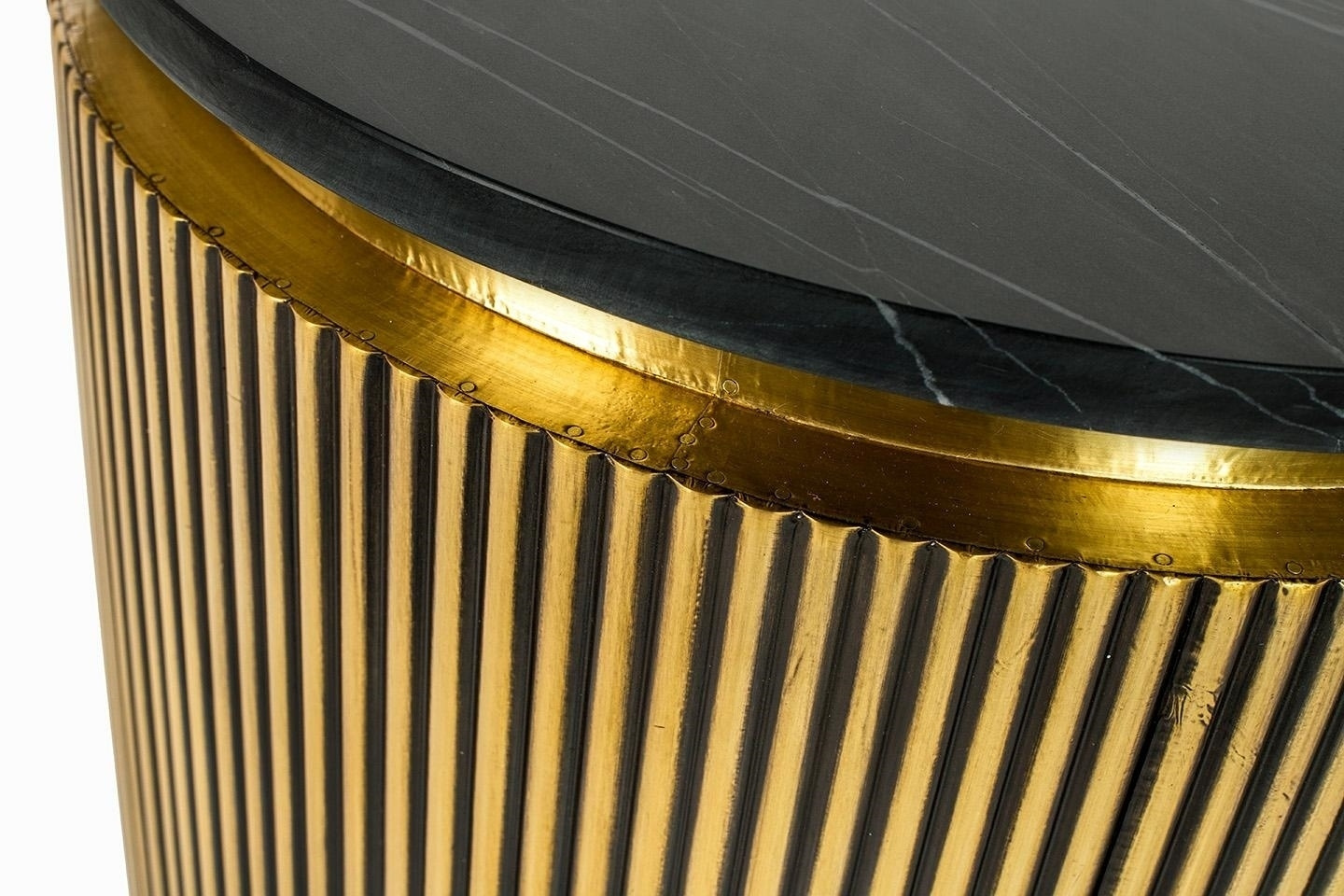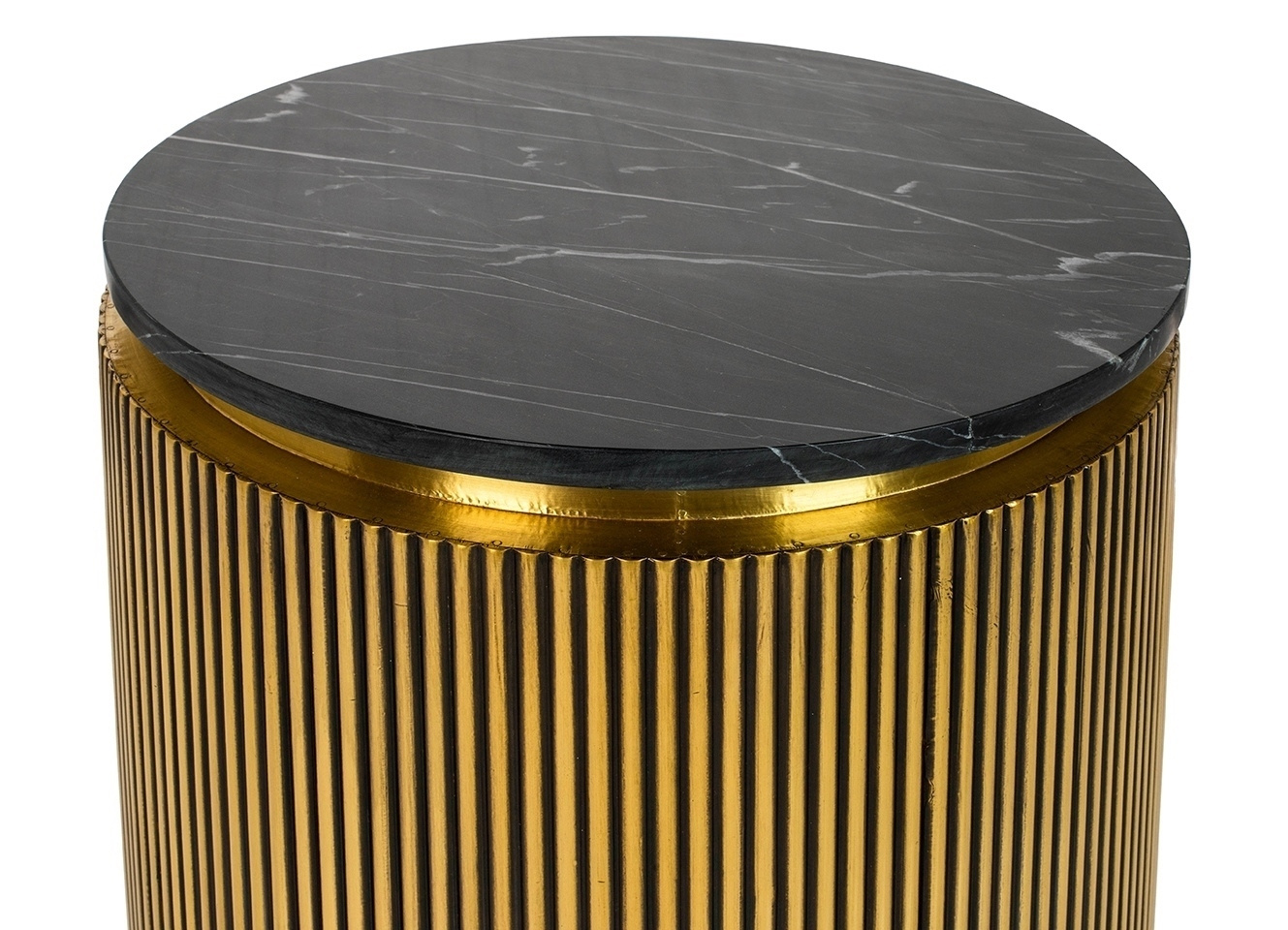 Kolekcja IRONVILLE to arystokracja zaklęta w nowoczesnych formach. Najlepiej zaprezentuje się w przestronnych pomieszczeniach. Każdy mebel został bardzo starannie wykonany z materiałów wysokiej jakości. W połączeniu z pięknym światłem metalowe akcenty rozjaśnią każdą przestrzeń. Czerń i odcienie złota to przepis na wnętrze z charakterem. Stolik boczny IRONVILLE to nie tylko użyteczny element wyposażenia, to również elegancka ozdoba wnętrza. Okrągły blat z grubego, czarnego marmuru świetnie komponuje się z mosiężnym korpusem. Rzeźbioną podstawę w kształcie walca wykonano z mocnej płyty MDF. Wymiary: wys. 61 cm / szer. 50 cm / gł. 50 cm.Cechy produktu