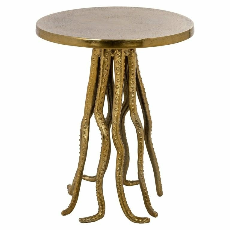 RICHMOND stolik MACEY złoty. Wyjątkowy stolik o kształcie meduzy. Stworzony został z aluminium i wykończony w pięknym złotym kolorze, który dodaje mu elegancji. Macey to produkt, który wniesie do Twojego wnętrza magiczną atmosferę. Doskonale sprawdzi się także jako stolik dekoracyjny w salonie. Wymiary: wys. 51 cm / szer. 41 cm / gł. 41 cm Waga brutto: 7,4 kg.Cechy produktu