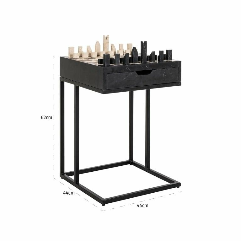 RICHMOND stolik szachowy DAVOS czarny. Unikatowy przykład połączenia klasycznej rozrywki z wyrafinowaną formą użytkową. Wykonany z metalu i MDF-u, zwieńczony jest szlachetnym, włoskim marmurem Dyna oraz głębokim czarnym marmurem morskim. Precyzyjne linie szachownicy i geometryczne figury przyciągają wzrok, a wysuwana szuflada ukrywa miejsce na przechowywanie pionków. Grubość blatu 3 cm dodaje solidności, a całość emanuje spokojnym luksusem. Idealny stolik do wnętrz, gdzie liczy się detal, styl i funkcja. Davos zachęca nie tylko do podziwiania jego formy, lecz także do intelektualnej rozrywki - partii szachów w najlepszym wydaniu. Wymiary: wys. 62 cm / szer. 44 cm / gł. 44 cm Waga brutto: 37 kg.