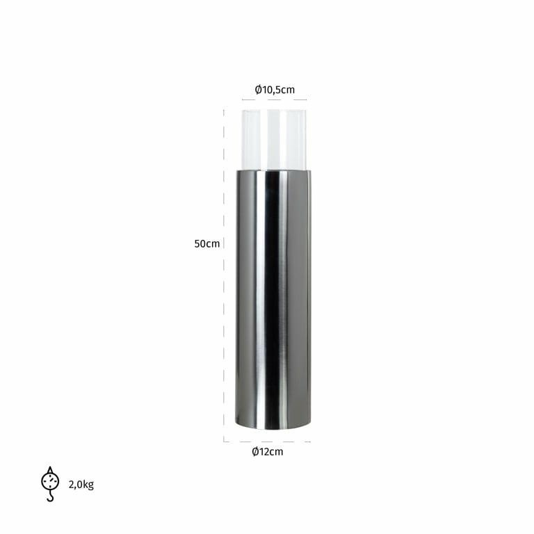 RICHMOND świecznik KIERA L. Elegancki, minimalistyczny świecznik Kiera marki Richmond Interiors został wykonany ze stali nierdzewnej i przezroczystego szkła. Prosta forma oraz błyszczące wykończenie, idealnie nada się do ozdobienia wnętrz Glamour. Dostępna również mniejsza wersja w rozmiarze S. Wymiary: wys. 50 cm / szer. 12 cm / gł. 12 cm Waga netto: 2 kg.Cechy produktu