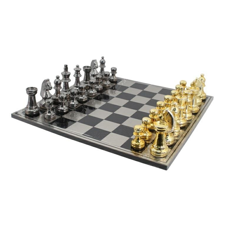 RICHMOND szachy SARAY. Szachy Saray to elegancki zestaw do gry wykonany z żywicy, który łączy klasyczny design z nowoczesnym wykończeniem. Elementy gry wyróżniają się efektownymi złotymi i srebrnymi akcentami, które dodają całości luksusowego charakteru. Plansza szachowa została zaprojektowana z myślą o estetyce, zapewniając jednocześnie wygodę podczas rozgrywki. Doskonały wybór zarówno dla miłośników szachów, jak i jako stylowy element dekoracyjny do salonu czy gabinetu. Wymiary: wys. 16 cm / szer. 60 cm / gł. 60 cm Waga netto: 9 kg.Cechy produktu