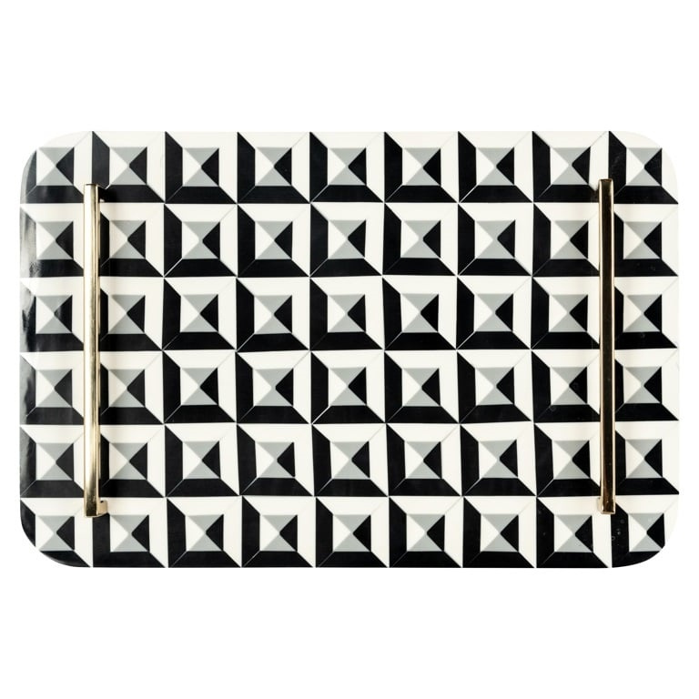 RICHMOND taca dekoracyjna BIRTE. Luksusowa taca, która przywołuje na myśl elegancję i nowoczesność. Biało-czarna rama została ozdobiona pięknym wzorem oraz złotymi uchwytami. Całość wykonano z żywicy oraz stali. Birte to sposób na stylowe udekorowanie Twojego wnętrza. Wymiary: wys. 5,5 cm / szer. 30 cm / gł. 46 cm Waga netto: 2,1 kg.Cechy produktu