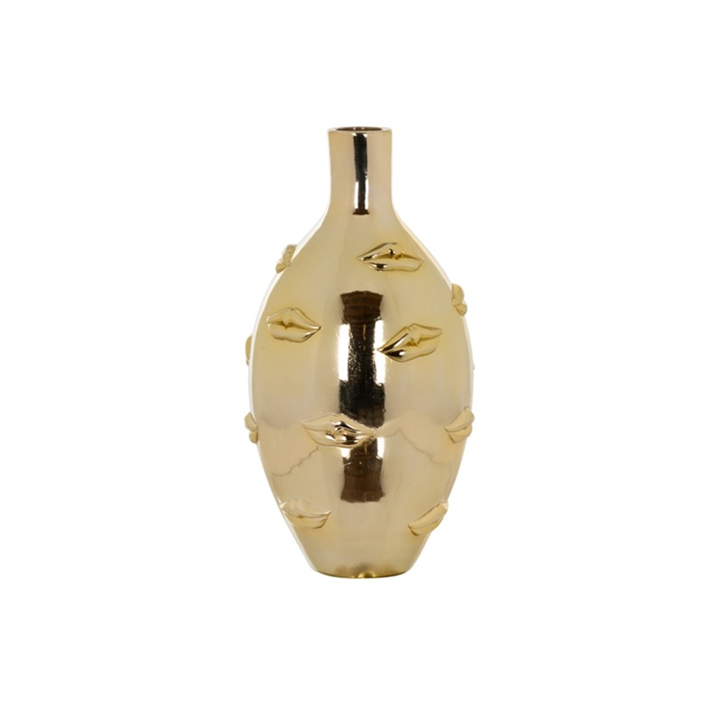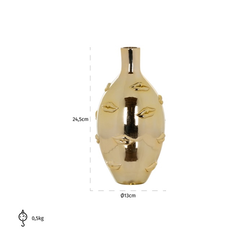 • RICHMOND wazon KISSES L złoty. Wazon został wykonany z wysokiej jakości materiału uzyskanego z żywicy. Dzięki swoim właściwościom jest on odporny na wodę, niełamliwy i trwały. Ozdoba posiada charakterystyczne wypukłe wzory w formie ust. Każdy detal został
