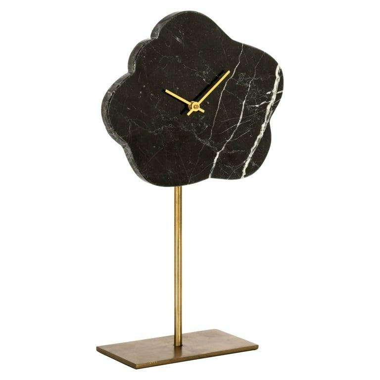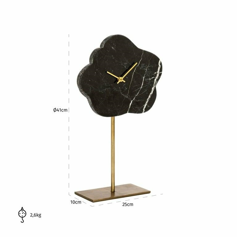 RICHMOND zegar stołowy BRAM czarny. Wyjątkowy i nowoczesny element dekoracyjny, który łączy w sobie elegancję marmuru z nietuzinkowym designem. Tarcza zegara wykonana jest z czarnego marmuru o subtelnych, naturalnych żyłkach, które dodają mu wyrafinowania. Kształt chmury nadaje mu artystyczny, abstrakcyjny charakter, dzięki czemu staje się wyrazistym akcentem w każdym wnętrzu. Złote wskazówki wyróżniają się na tle ciemnego marmuru, dodając zegarowi elegancji i podkreślając jego luksusowy styl. Zegar jest umieszczony na smukłej, złotej podstawie z metalu, która zapewnia stabilność i harmonijnie komponuje się z całością. Zegar stołowy Bram to idealny dodatek do nowoczesnych, jak i klasycznych aranżacji, wnosząc do wnętrza odrobinę artyzmu i elegancji. Wymiary: wys. 41 cm / szer. 25 cm / gł. 25 cm Waga netto: 3,65 kg.Cechy produktu