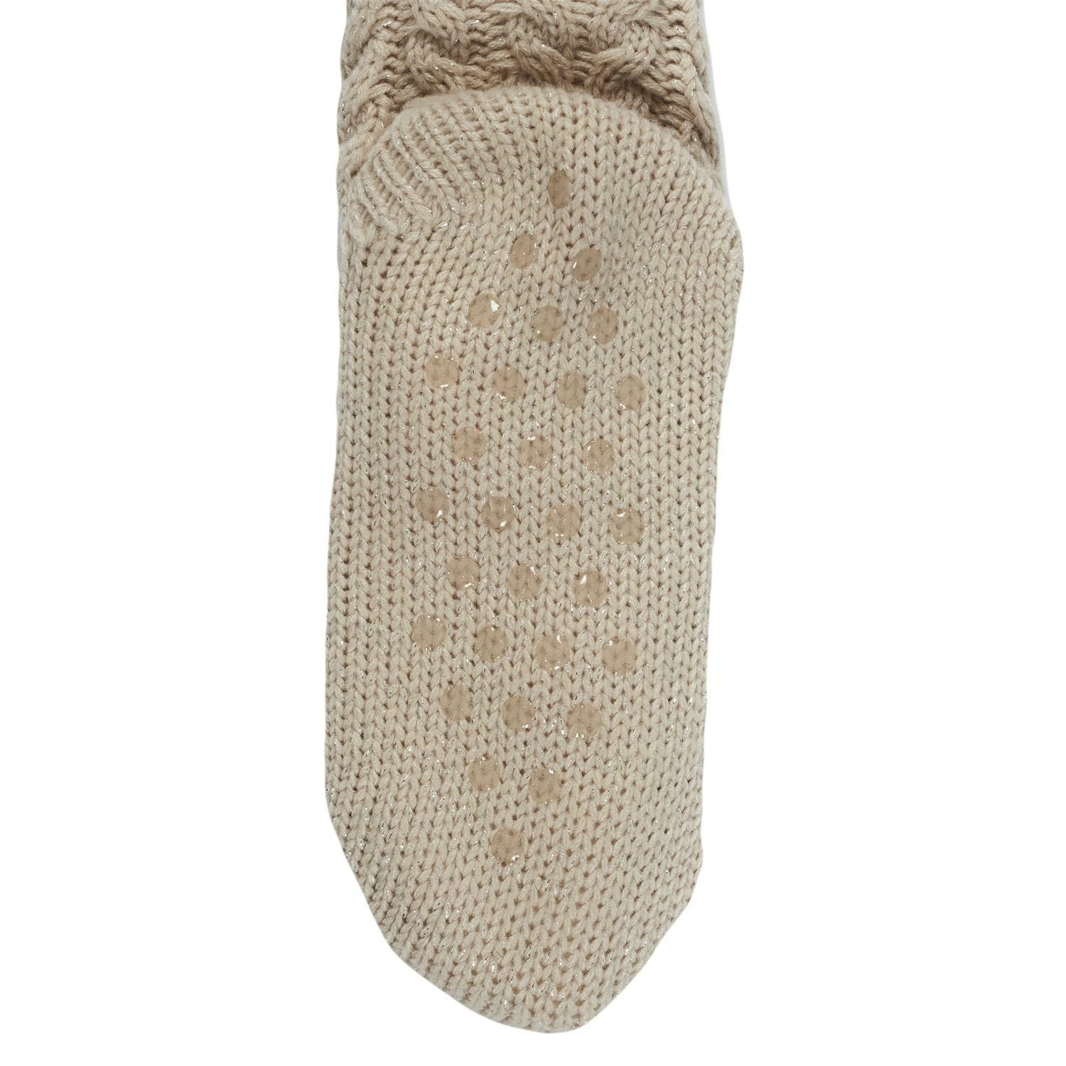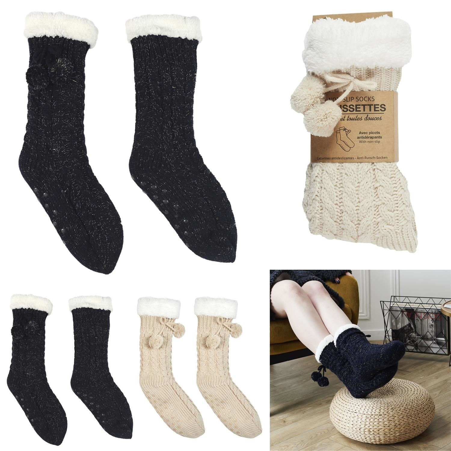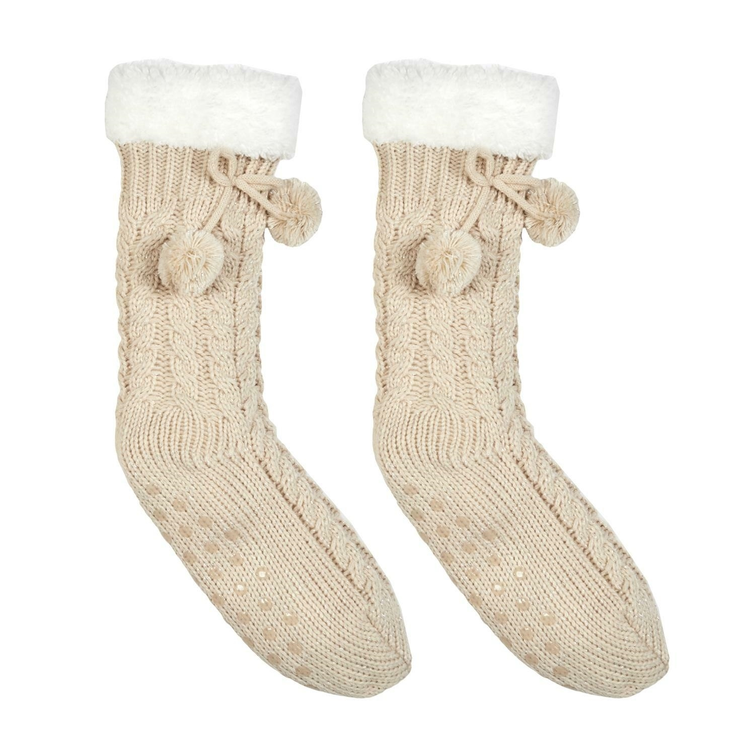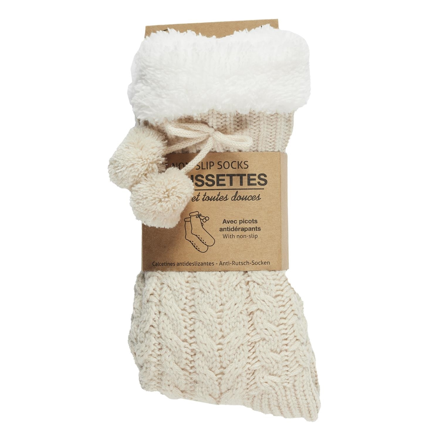 Ciepłe, wygodne skarpety w uniwersalnym rozmiarze sprawdzą się podczas zimowych wieczorów. Skarpety mogą być prezentem dla osoby więcznie zmarźniętej lub dla nas samych, aby otulić się kocem i włożyć stopy w miękkie i komfortowe skarpety zimowe. Ozdobione klasycznym splotem o kształcie warkocza i zdobione 2 pomponami. Materiał 100% poliester. Wyposażone w wypustki antypoślizgowe.Cechy produktu