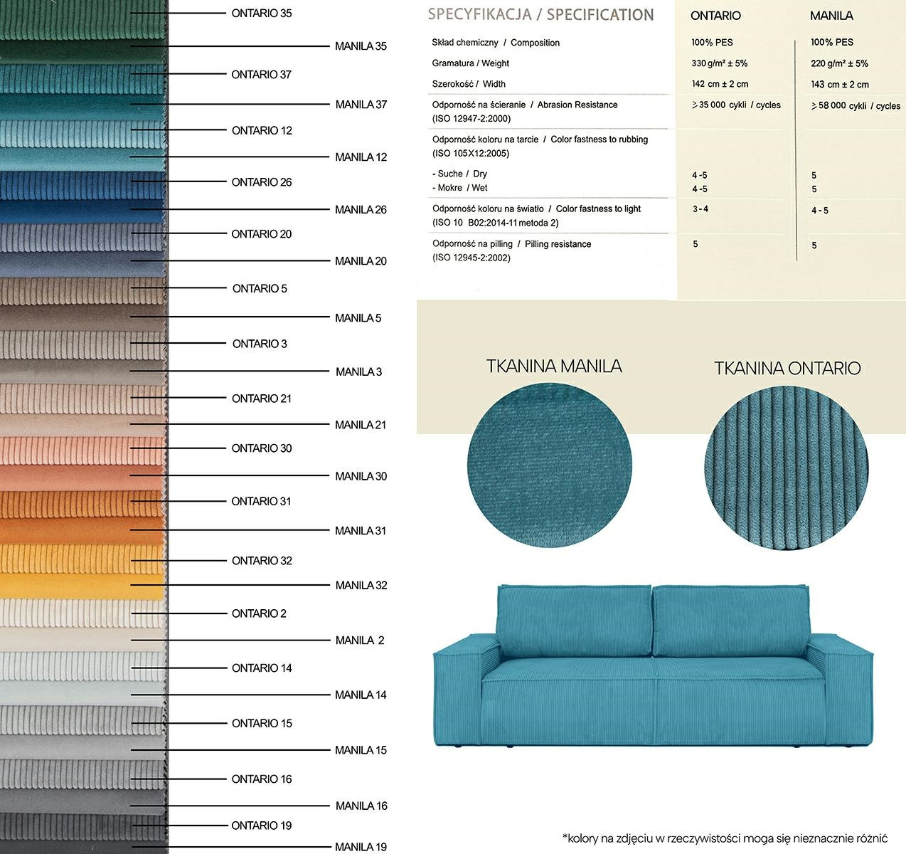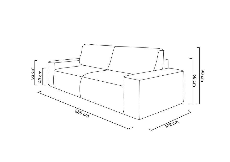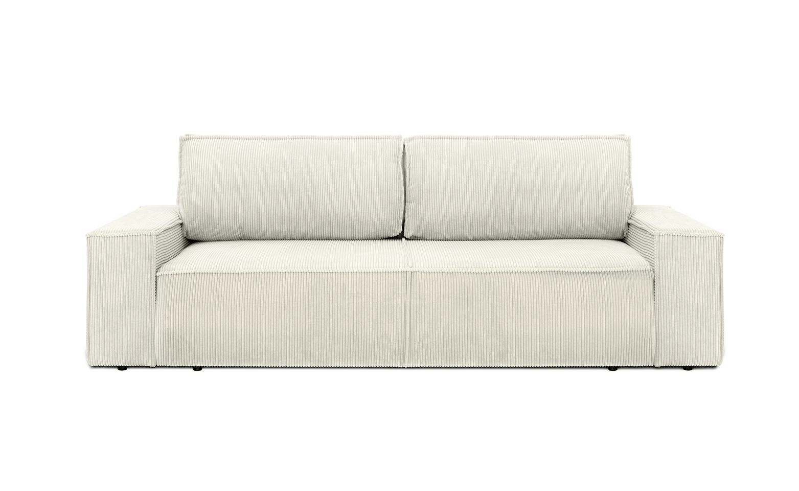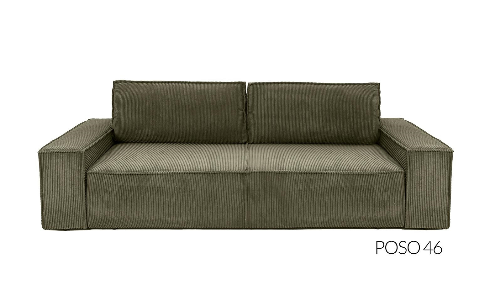 Sofa PILLOW z funkcją spania jasny beż. Elegancka, ponadczasowa sofa wyprodukowana w Polsce. Siedzisko i oparcie wykonano ze sprężyny falistej oraz pianki PUR, która zapewnia najwyższą trwałość oraz wygodę. Całość wykończono w przyjemnej w dotyku tkaninie sztruksowej w jasnym beżowym odcieniu o nazwie Poso 38. Jest to materiał odporny na ścieranie oraz działanie światła. Dodatkowy komfort zapewniają poduszki, które doskonale sprawdzą się po rozłożeniu mebla do nocnego wypoczynku. Dzięki wbudowanemu pojemnikowi na pościel zaoszczędzisz dużo miejsca. Możliwość personalizacji sprawia, że możesz dopasować sofę do swoich potrzeb. Cena produktu personalizowanego może się różnić. Wymiary: wys. 90 cm (z poduszką/ bez poduszki: 68 cm) / szer. 255 cm / gł. 102 cm Wysokość do krawędzi siedziska: 43 cm Podłokietniki: wys. 53 cm / szer. 29 cm / gł. 102 cm Głębokość po rozłożeniu: 145 cm Poduszka: 50 x 100 x 25 cm.Cechy produktu